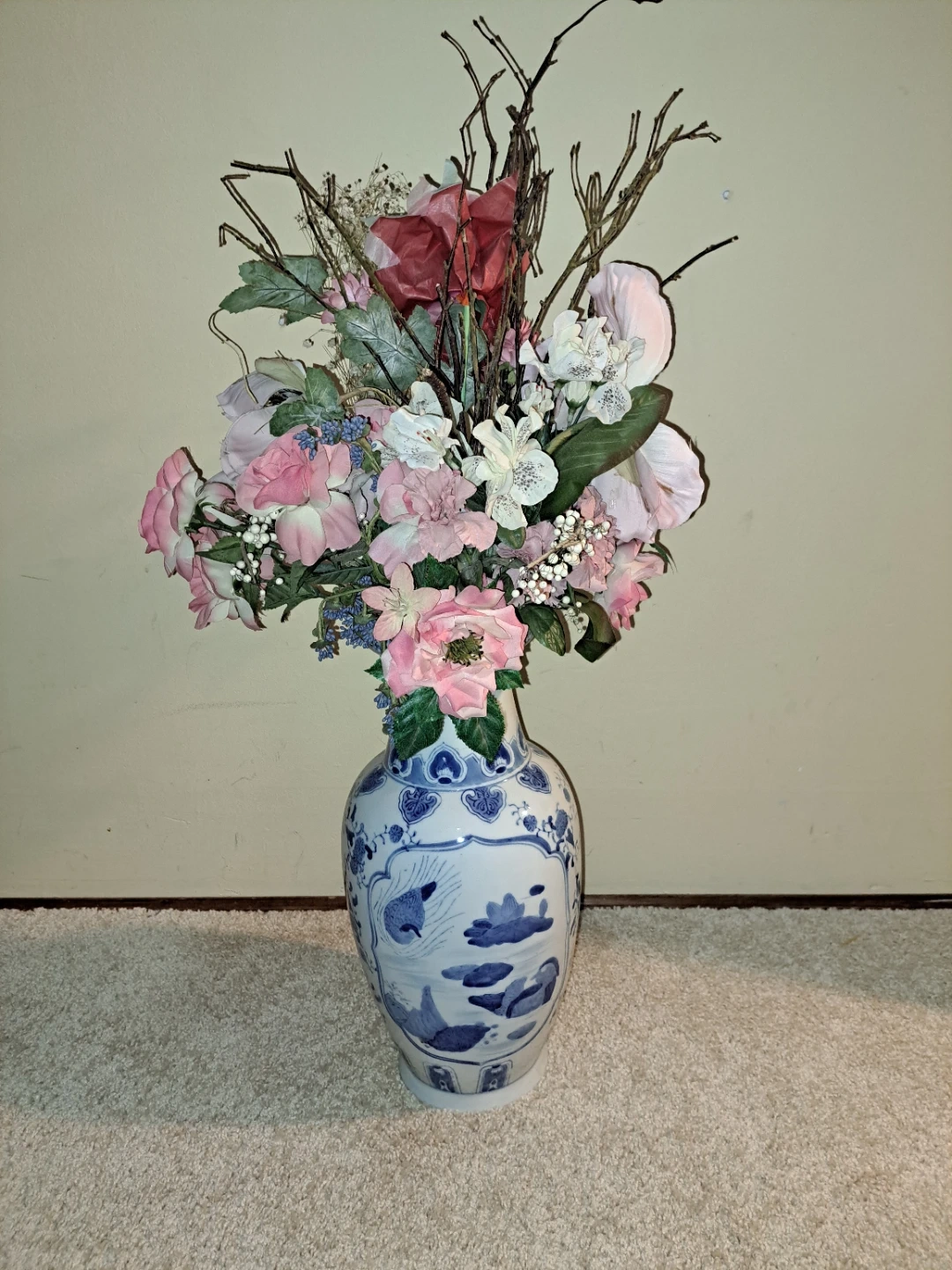 Beautiful blue and white vase with a floral arrangement! Height of vase is 16 in. Around it is 26 in. It's in great condition and would look lovely in any home