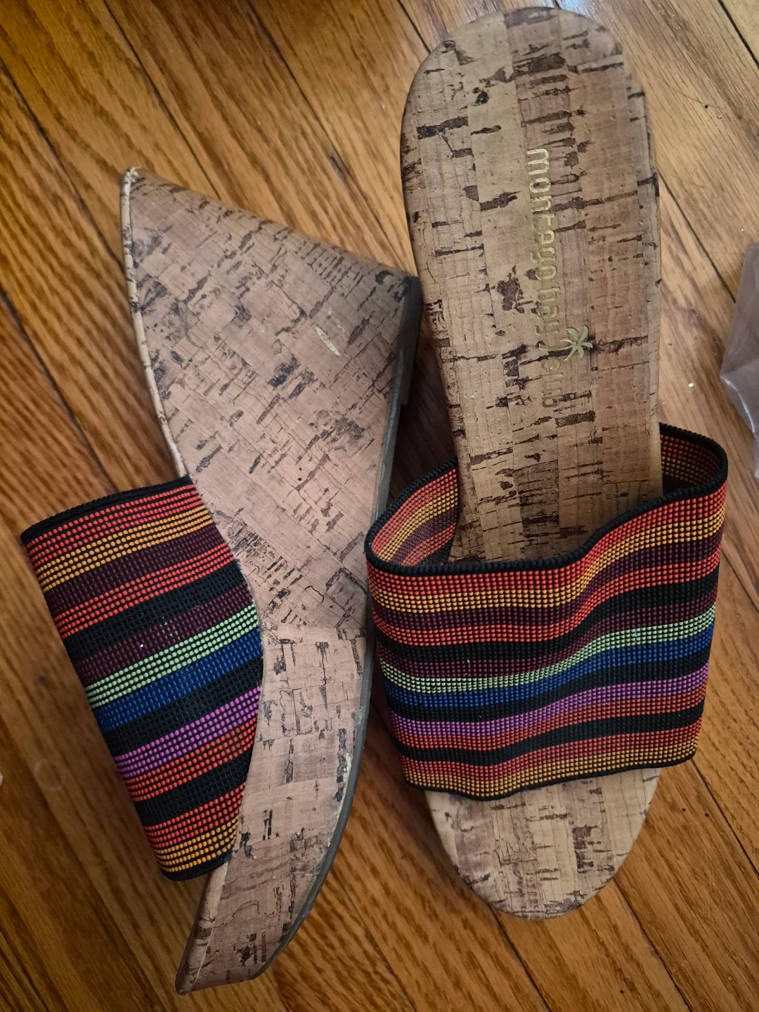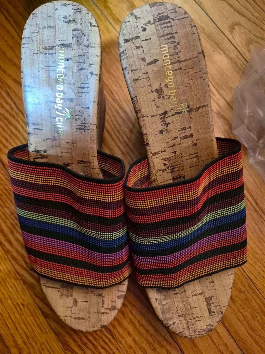 Cute Montego Bay Club shoes with a rainbow striped band! They have a cork-like wedge heel, perfect for adding a bit of height and colour to your outfit