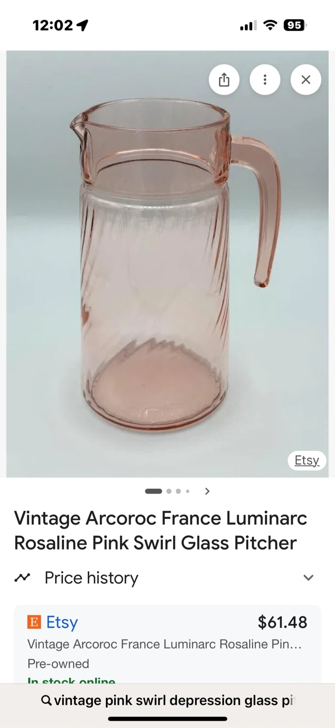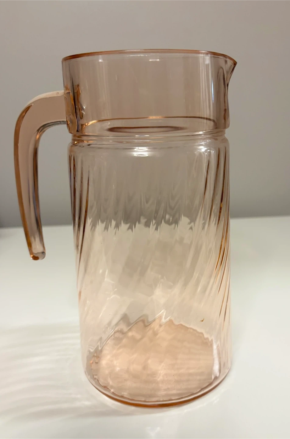 Selling a vintage Depression Glass Arcoroc France Luminarc Rosaline Pink Swirl Glass Pitcher! It's in great condition and would be a lovely addition to any kitchen or collection