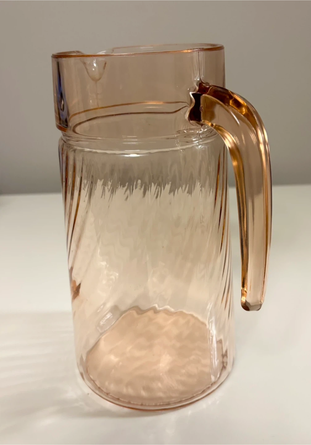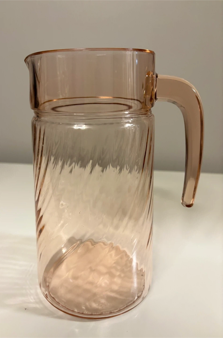 Selling a vintage Depression Glass Arcoroc France Luminarc Rosaline Pink Swirl Glass Pitcher! It's in great condition and would be a lovely addition to any kitchen or collection
