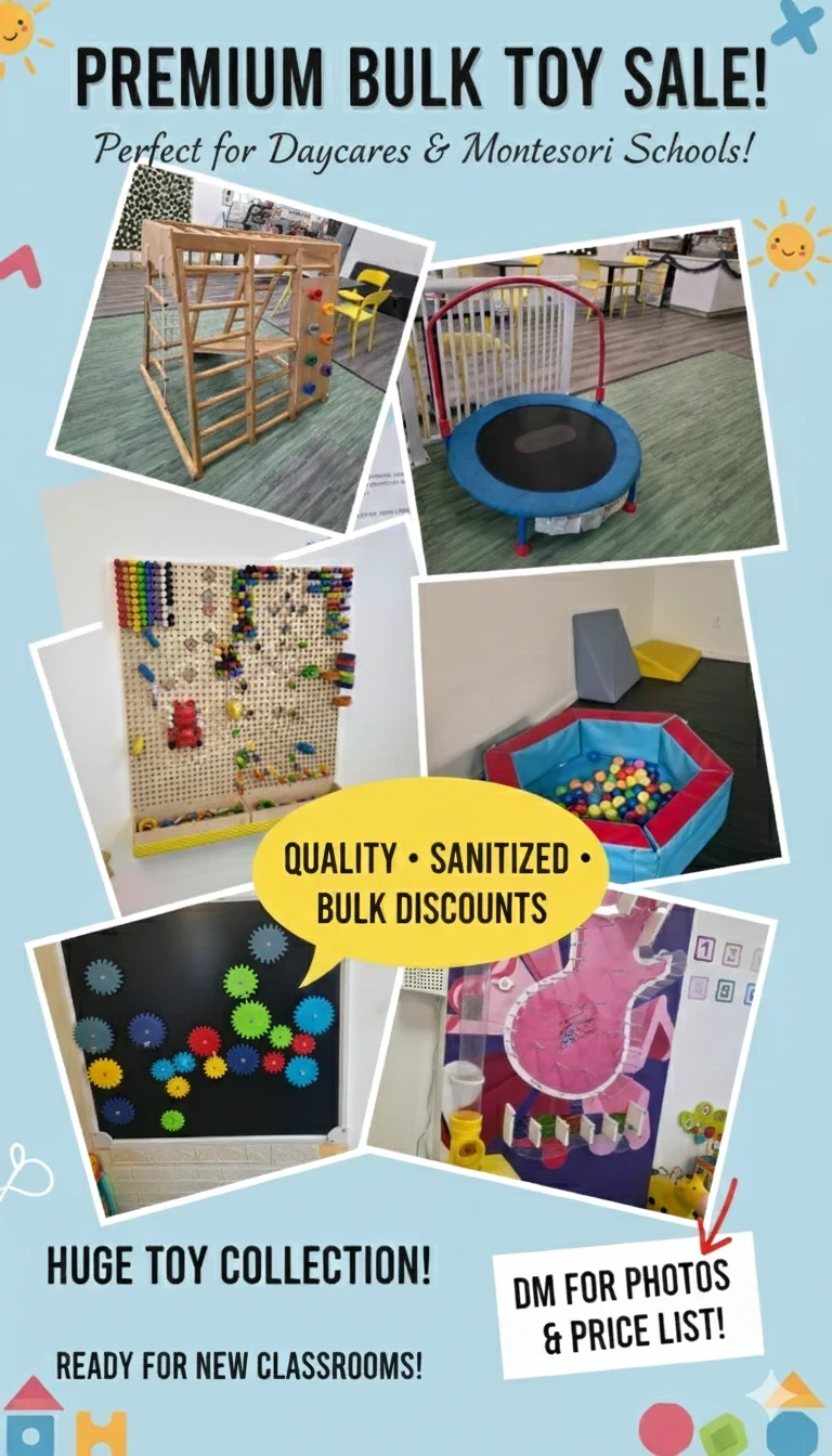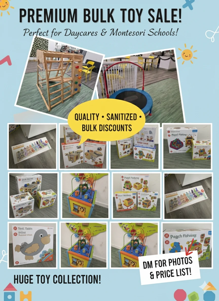 I'm selling a huge toy collection perfect for daycares and Montessori schools! All toys are quality, sanitized, and available at bulk discounts. DM for photos and price list if you're interested!