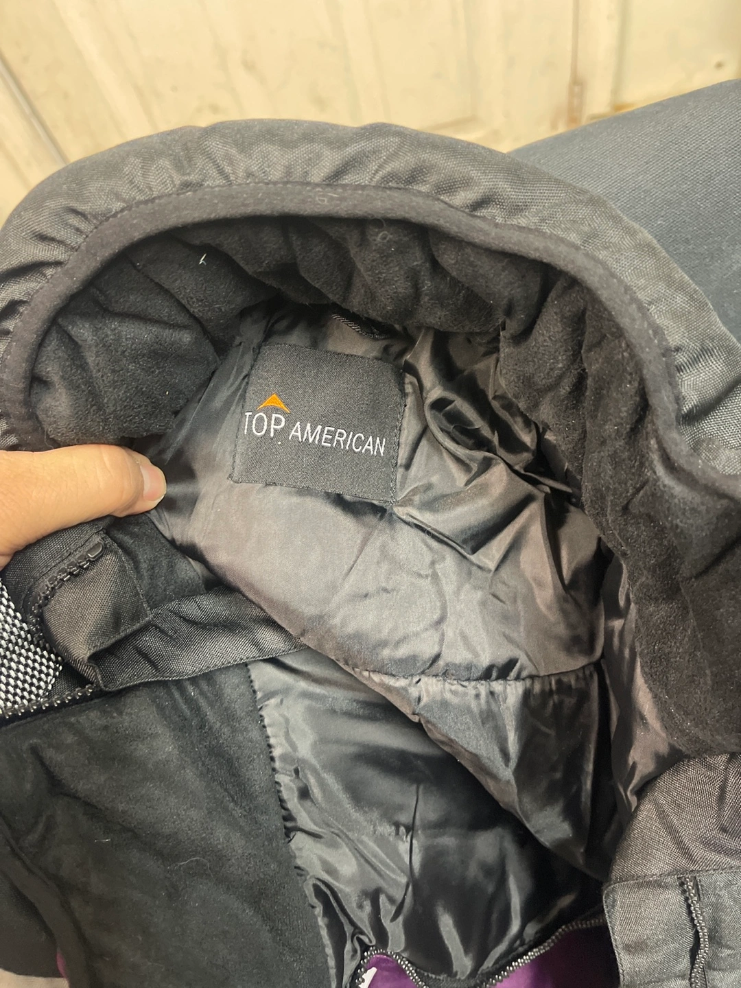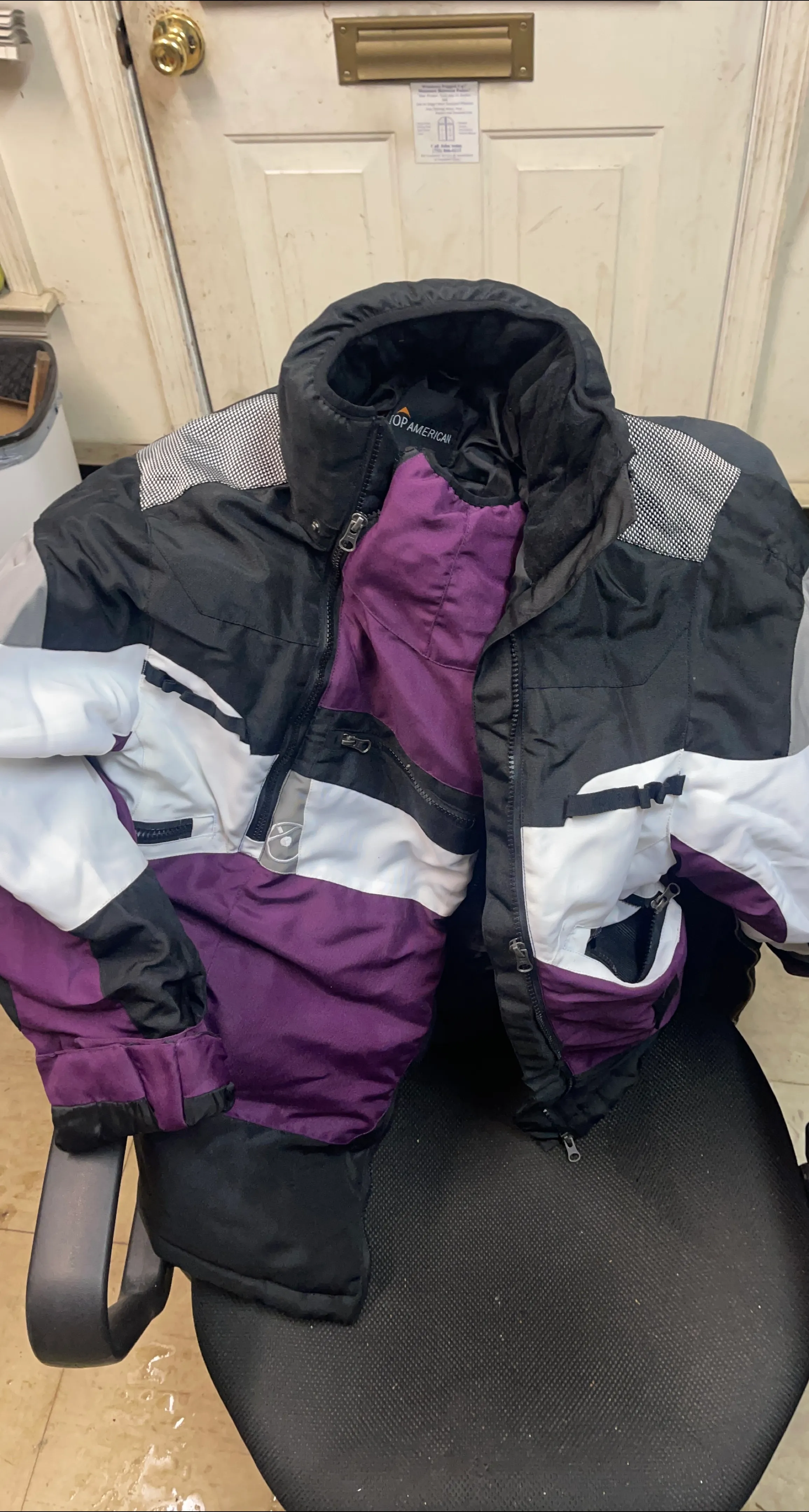 Here's a Top American ski jacket in a cool color scheme of black, white, and purple! It looks like it's in good condition and ready for the slopes or just staying warm this winter