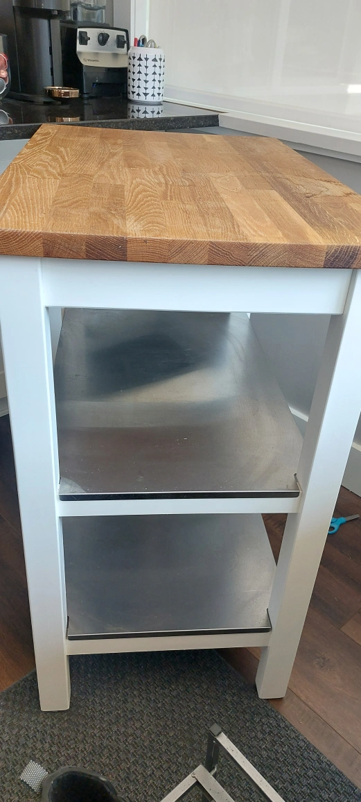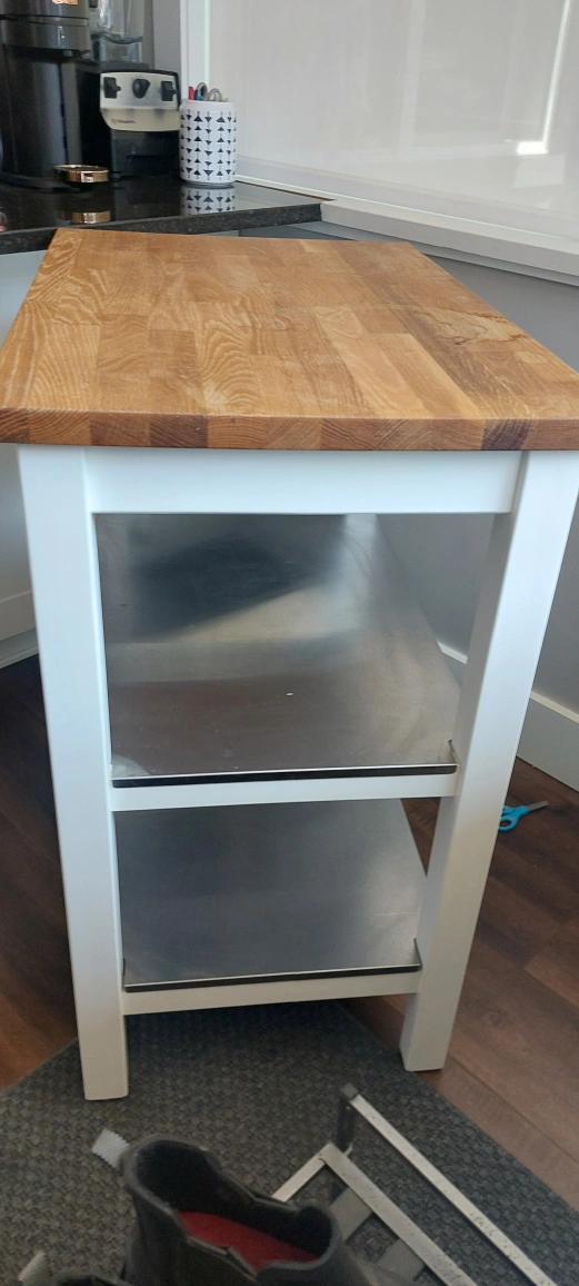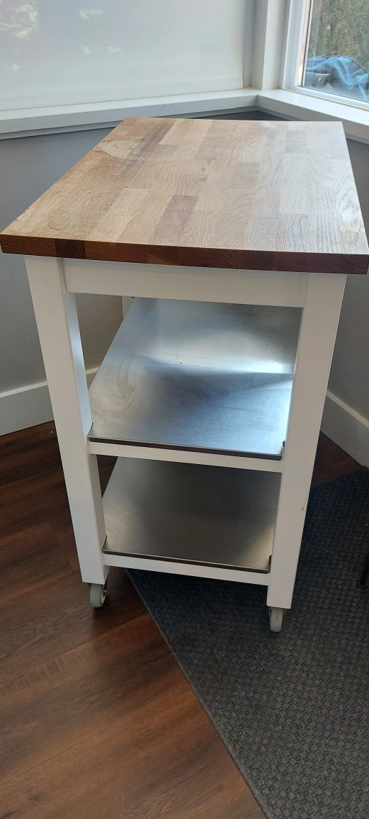 Standalone kitchen island that can be easily moved around thanks to the wheels. This has always stayed in the same place and is in great condition. There are 2 marks on the wood countertop that I have circled for reference. This has been AWESOME in terms of extra storage but I am paring down alot of my items. Sad to see her go but she definitely has many more years left in her!