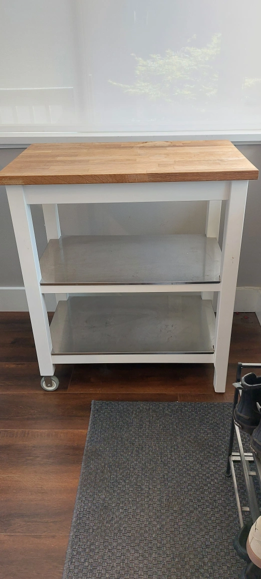 Standalone kitchen island that can be easily moved around thanks to the wheels. This has always stayed in the same place and is in great condition. There are 2 marks on the wood countertop that I have circled for reference. This has been AWESOME in terms of extra storage but I am paring down alot of my items. Sad to see her go but she definitely has many more years left in her!