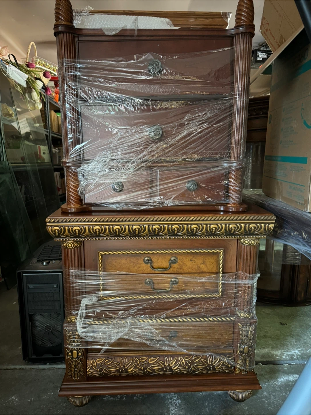 I have a collection of dark wood furniture that I no longer need. The set includes a dining table with chairs, a wine cabinet, a display cabinet, a dresser, nightstands, a set of sofa, coffee tables, and more. Although some pieces show minor signs of use, all are in good functional condition.