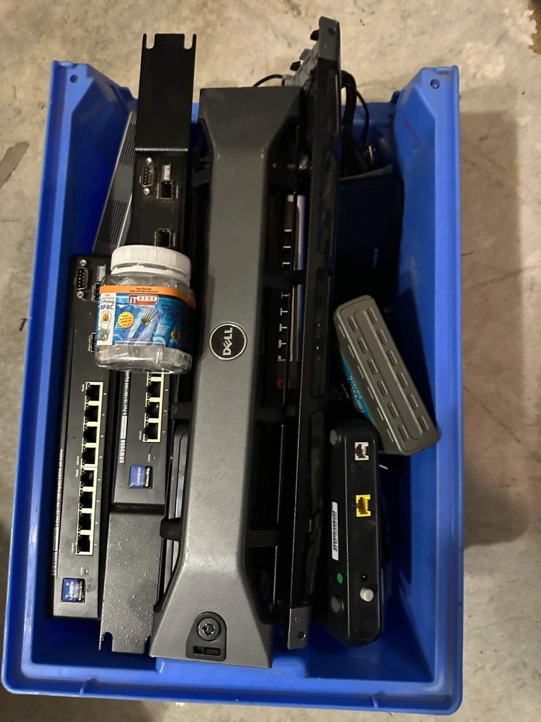 Clearing out some old server and networking equipment, including a Dell server component and a Linksys switch. Perfect for anyone looking to upgrade or experiment with their home network setup!