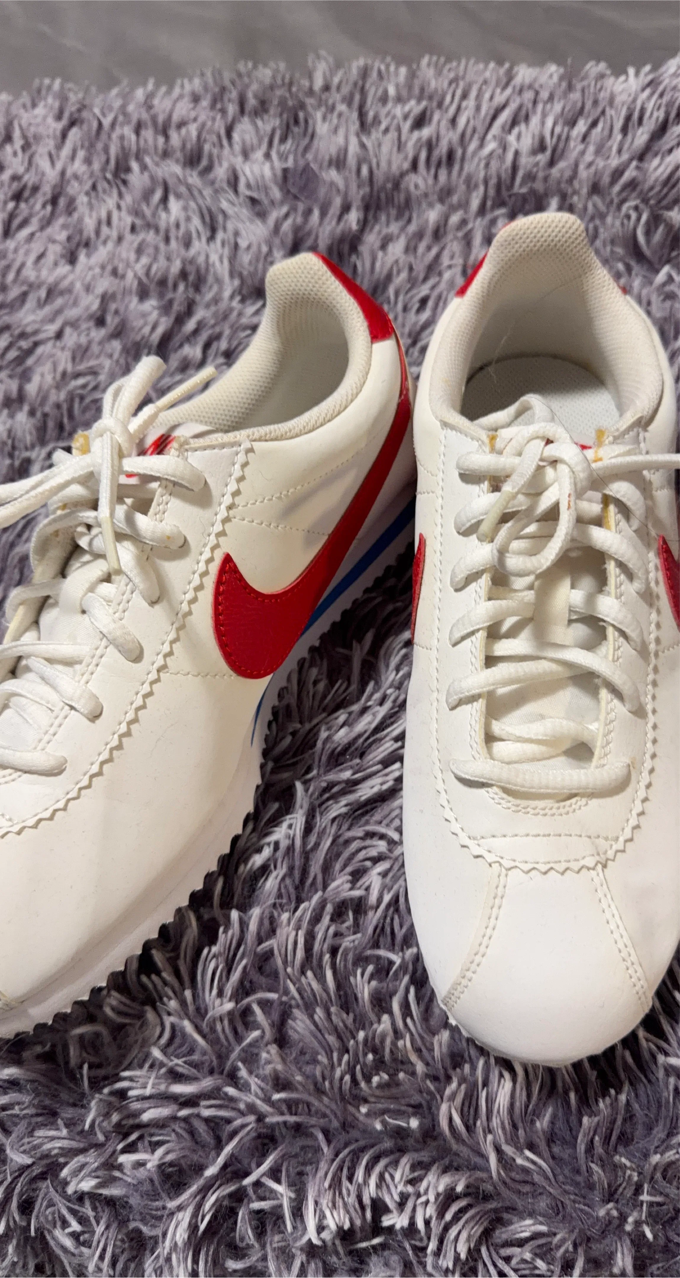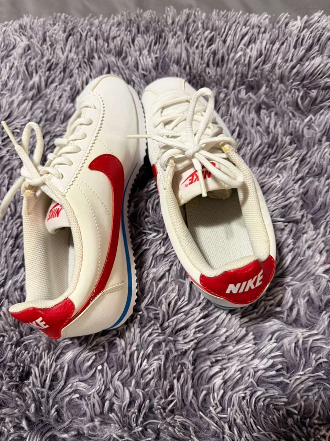 Selling a pair of Nike Cortez in a kids size 6Y. They feature a white leather upper with a red swoosh and blue accents. Great for everyday wear!