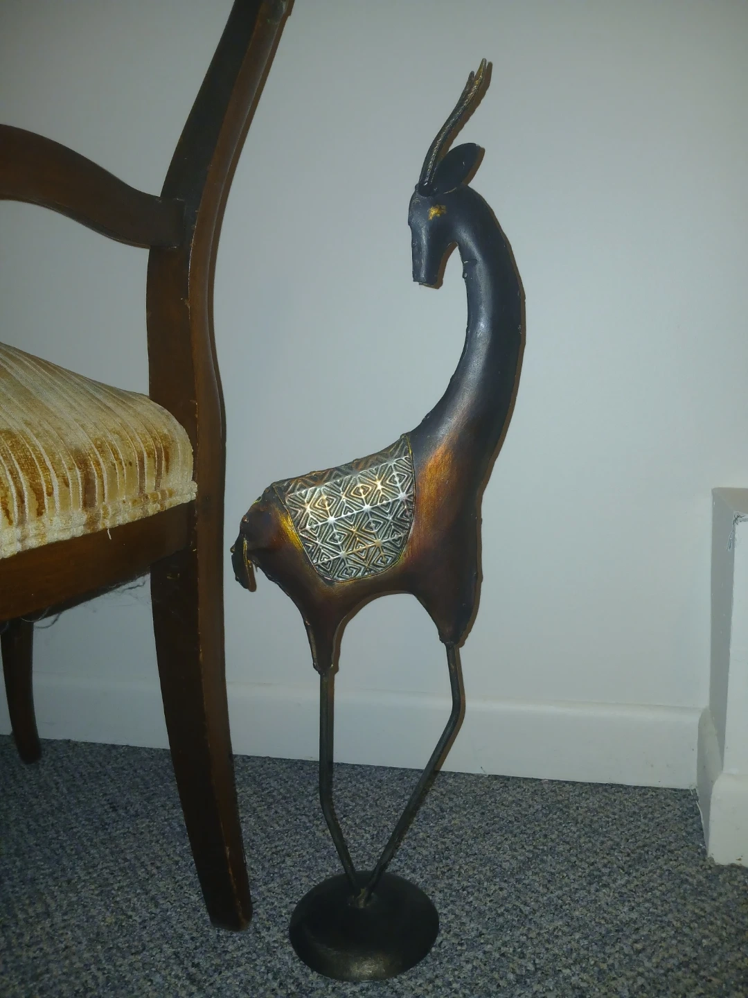 Here's a unique metal giraffe sculpture that would look great in any room! It has a saddle with a geometric pattern and a sturdy metal base. It's in great condition and ready to be displayed in your home