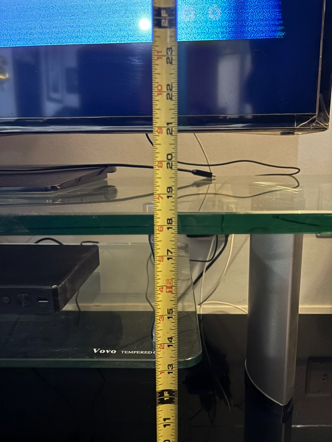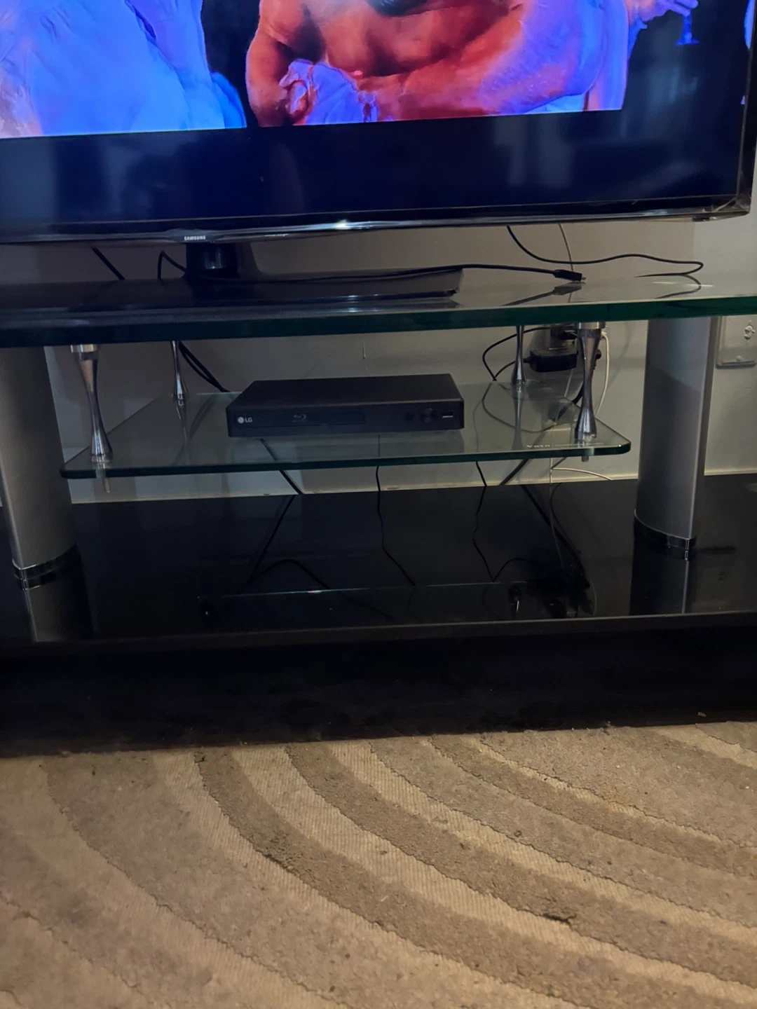 Selling a sleek black glass TV stand. It's in great shape and measures approximately 69 inches wide and 21 inches tall. Perfect for your living room setup! Very heavy Need a couple people to move it