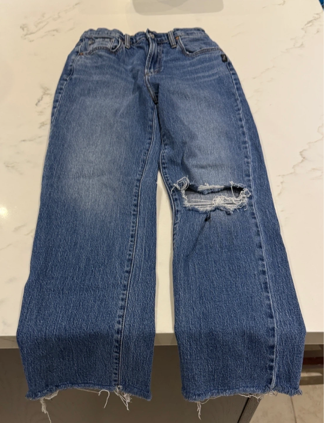 Here are some Silver Jeans Co. denim jeans. They are a blue colour and have a distressed look with a ripped knee. Great for a casual look! Inseam 28”