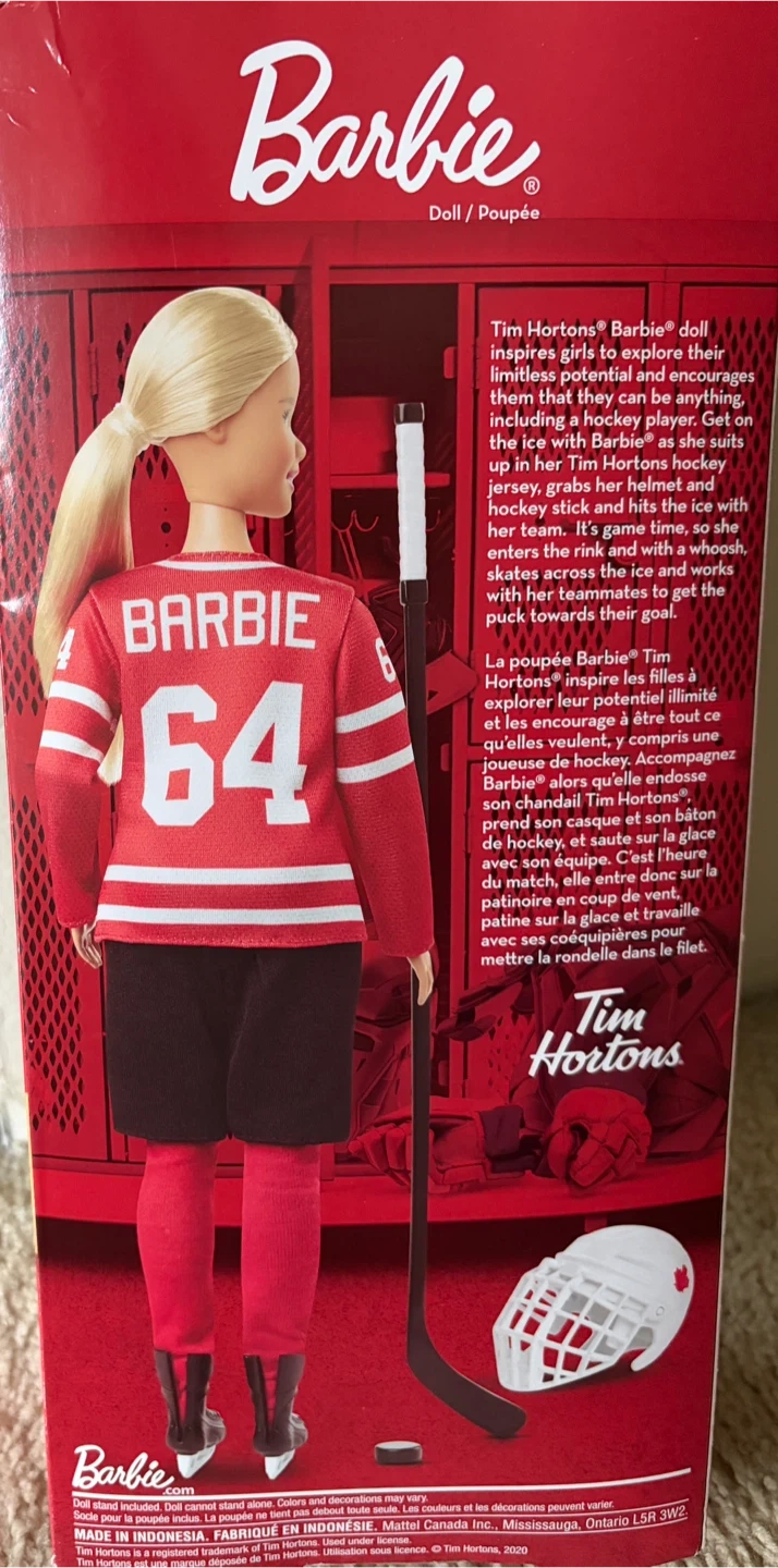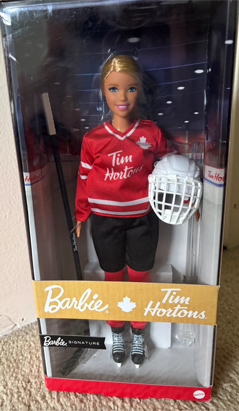 Selling a Tim Hortons Barbie doll dressed as a hockey player! She comes with her hockey jersey, stick, and helmet. This doll is perfect for collectors or any Barbie fan who loves hockey!