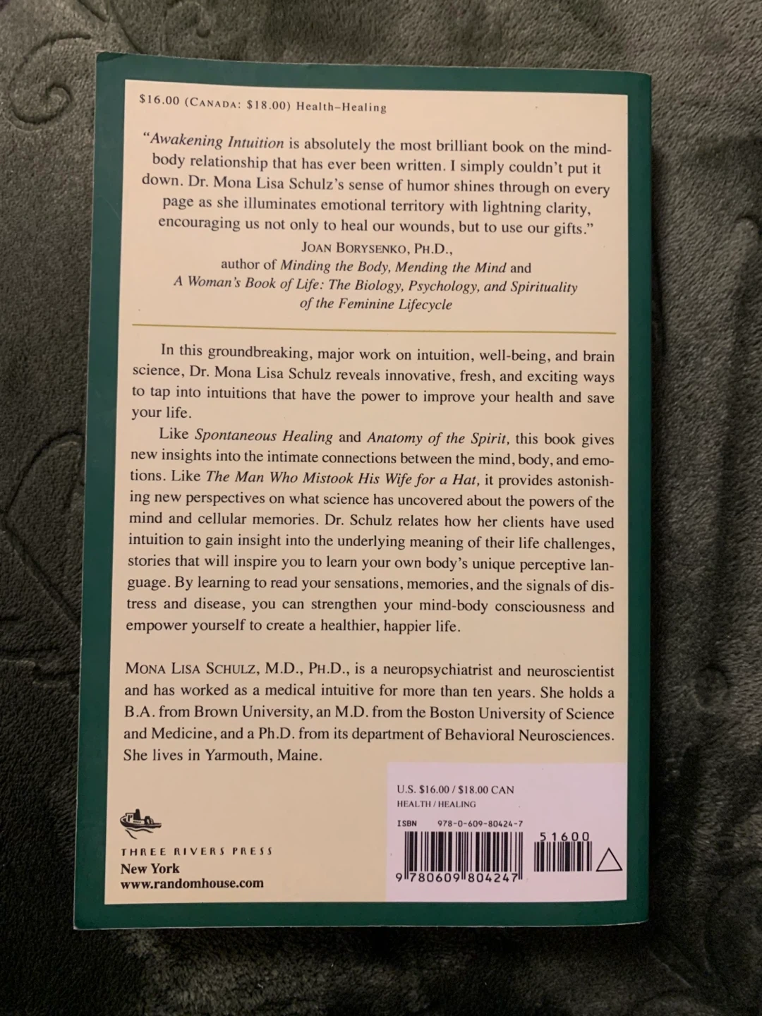 Selling the book Awakening Intuition by Mona Lisa Schulz. It explores using your mind-body network for insight and healing. A great read for anyone interested in well-being and intuition