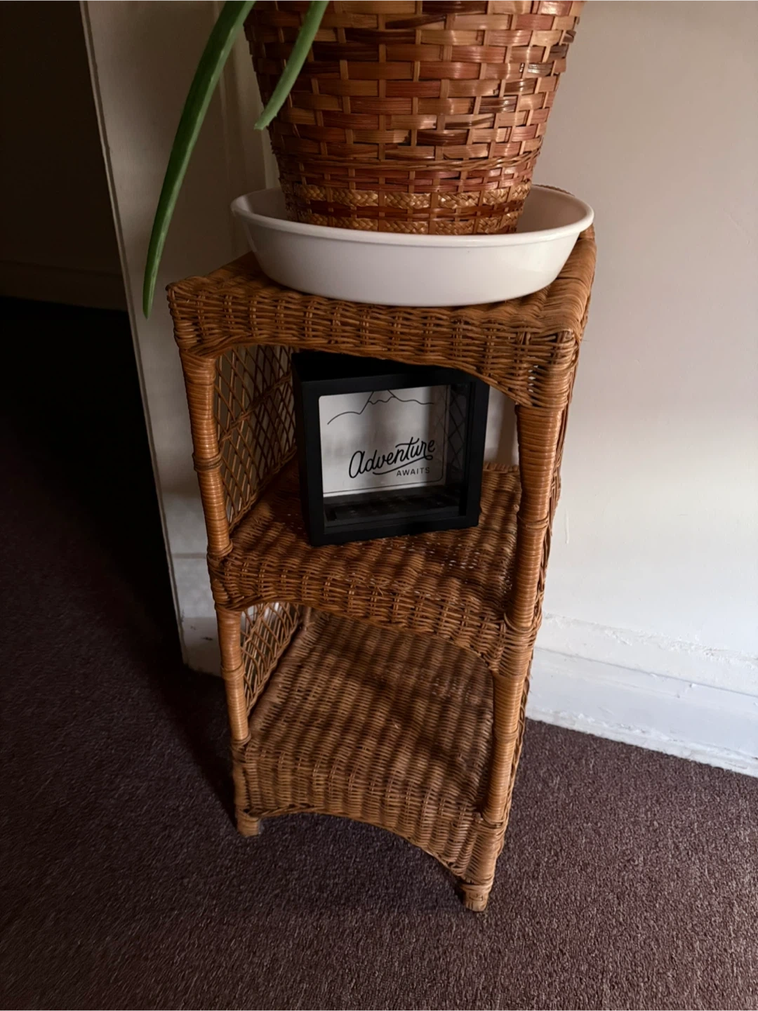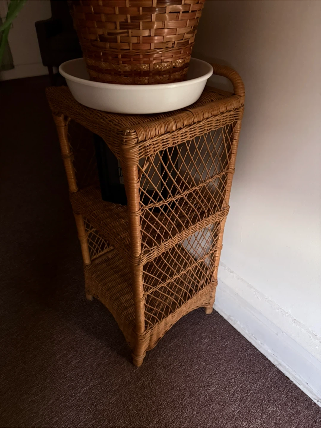 Selling a wicker plant stand with three tiers. It's perfect for adding a touch of natural texture to your home decor. The stand is sturdy and in good condition, ready to display your favorite plants or other decorative items.