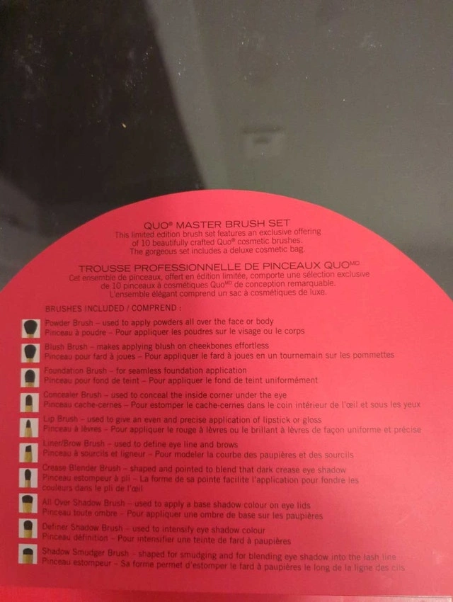 New Quo Master Brush Set, 10 cosmetic brushes with bag. Never used. One of the brushes fell from its space, but it's inside the box.