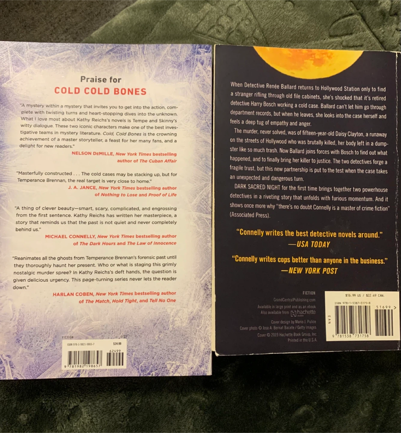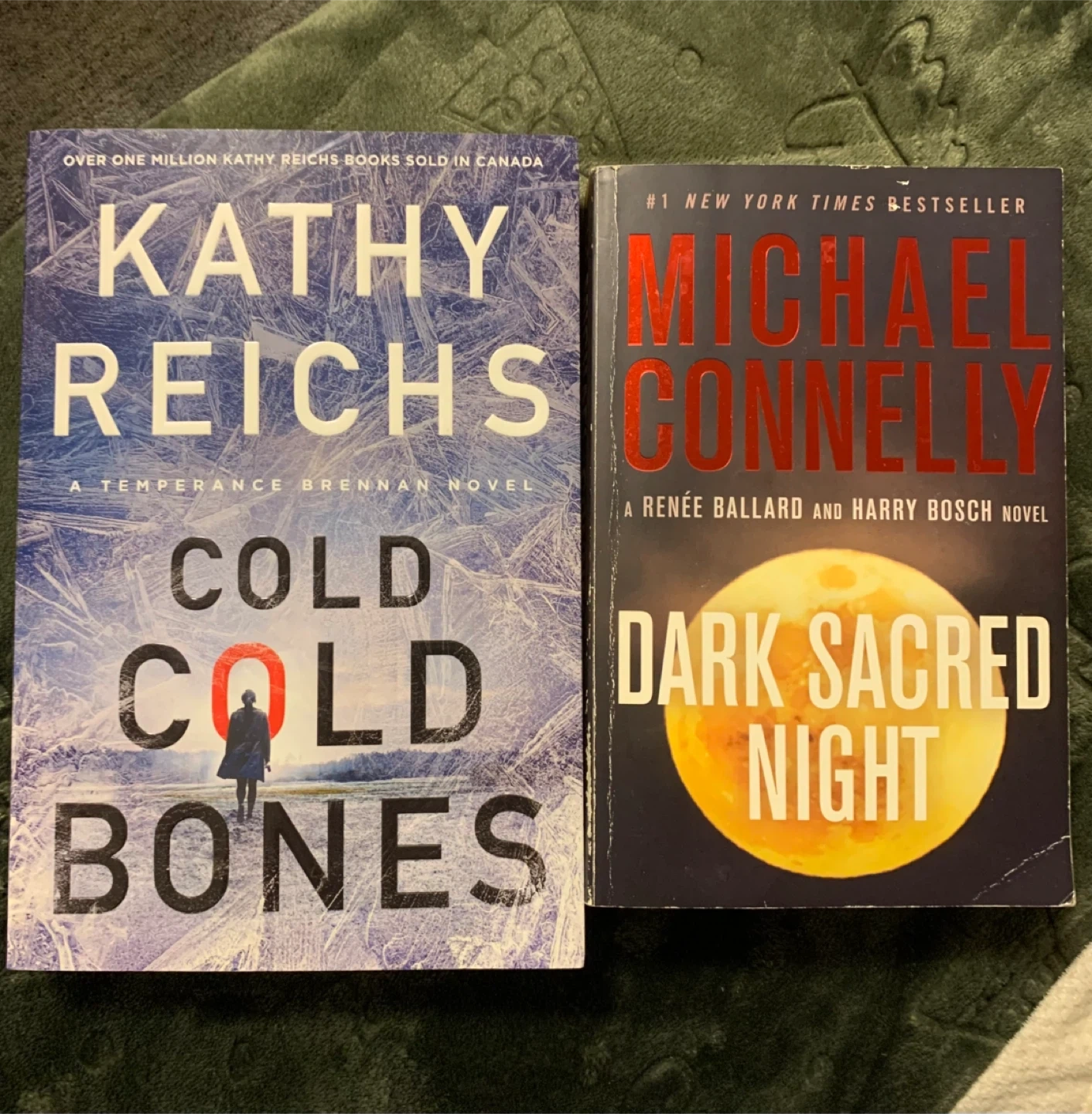 Selling two books: Kathy Reichs' "Cold Cold Bones" (A Temperance Brennan Novel) and Michael Connelly's "Dark Sacred Night" (A Renée Ballard and Harry Bosch Novel). Both are in great condition.