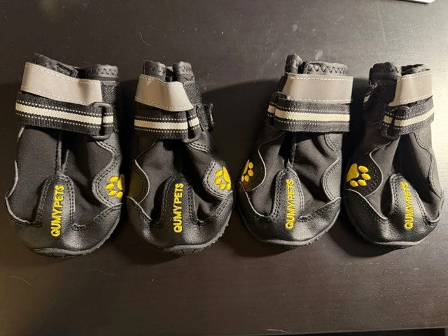 Qumy Size 8 dog boots. Excellent condition, hardly used because they were a tad too large for my dog. They have a reflective strap, good grip on the sole, two vectro straps to secure, and a light fleece lining for warmth. Rough size of paw: 3"W x 3"L $20 obo. Cash accepted