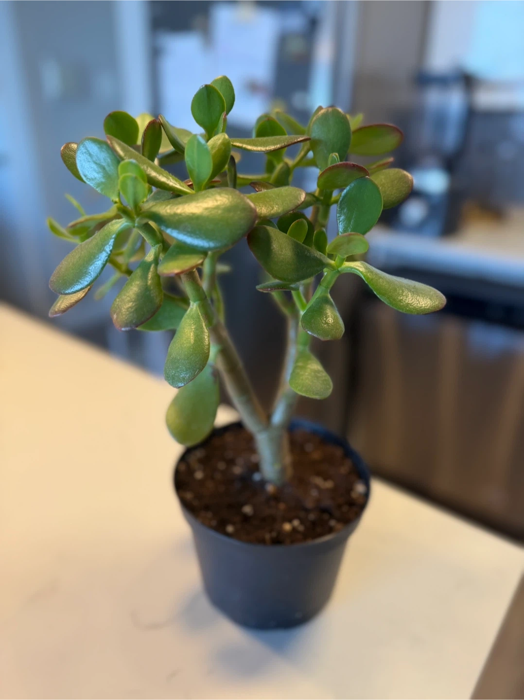 Here's a lovely jade plant in a simple black grower pot! It's a great little plant to add some greenery to your space. It's in good condition and ready for a new home.