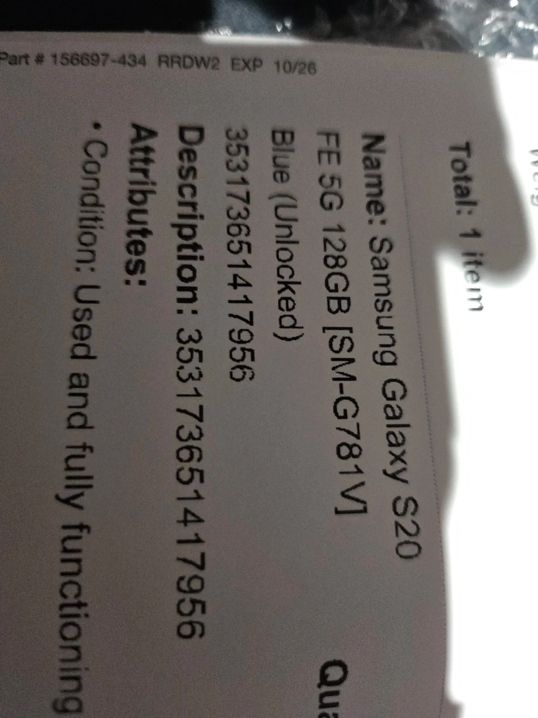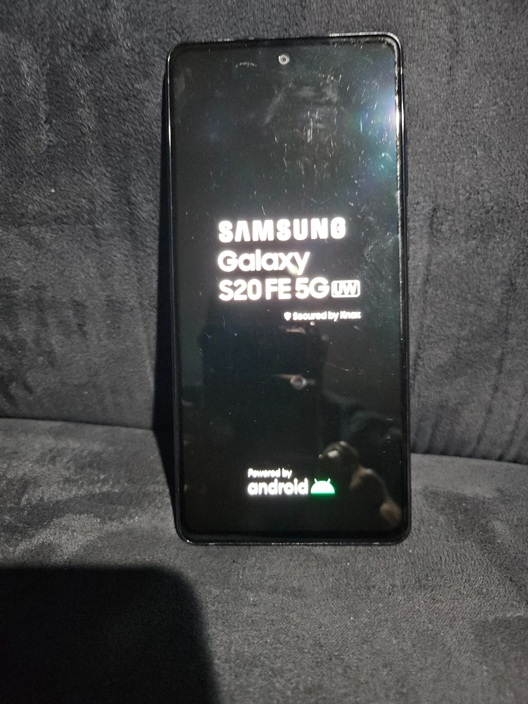 Selling a used Samsung Galaxy S20 FE 5G with 128GB of storage. It's unlocked and comes in a stylish blue color. The phone is used but fully functioning. Expiration date is 2026 October.