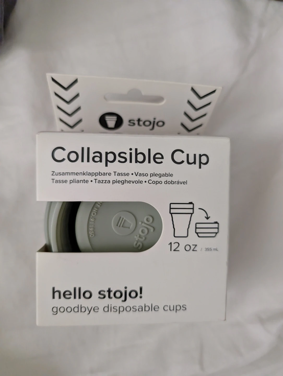 I'm selling a brand new Stojo Collapsible Cup! This cup is perfect for anyone looking to reduce their use of disposable cups. It's gray, holds 12 oz / 355 mL, and collapses for easy storage. It's leak-proof, stowable, and reusable. Get yours today!
