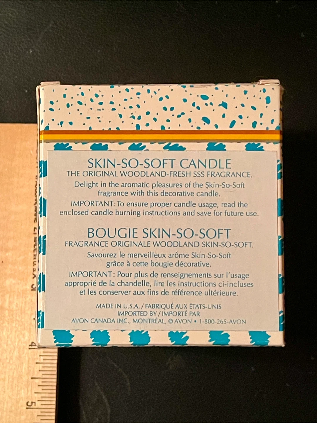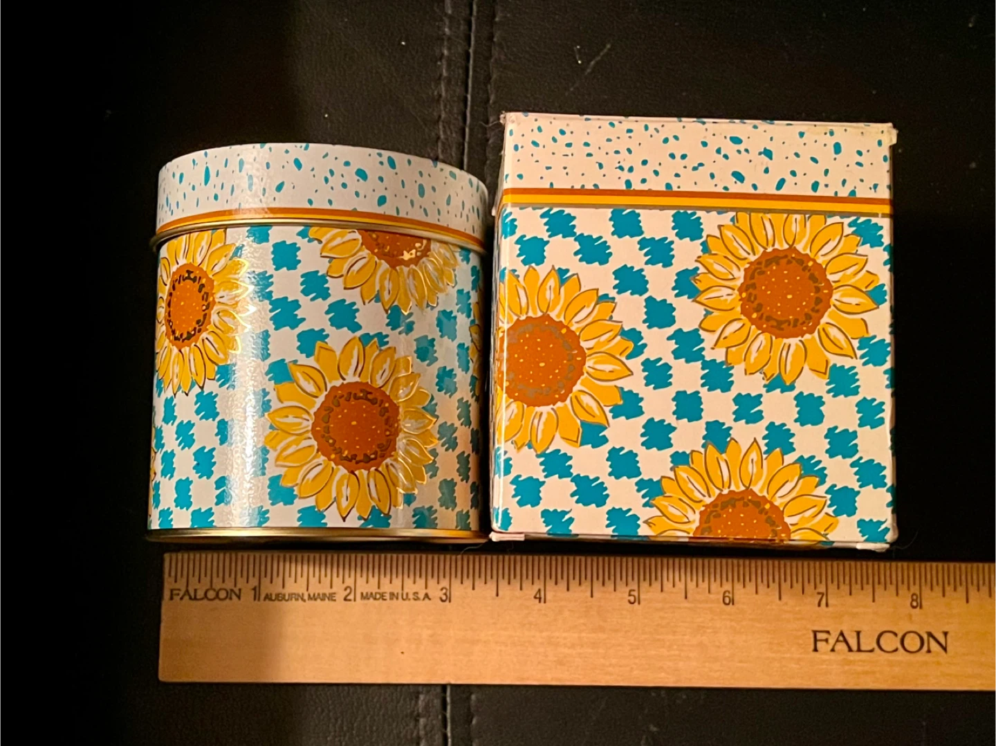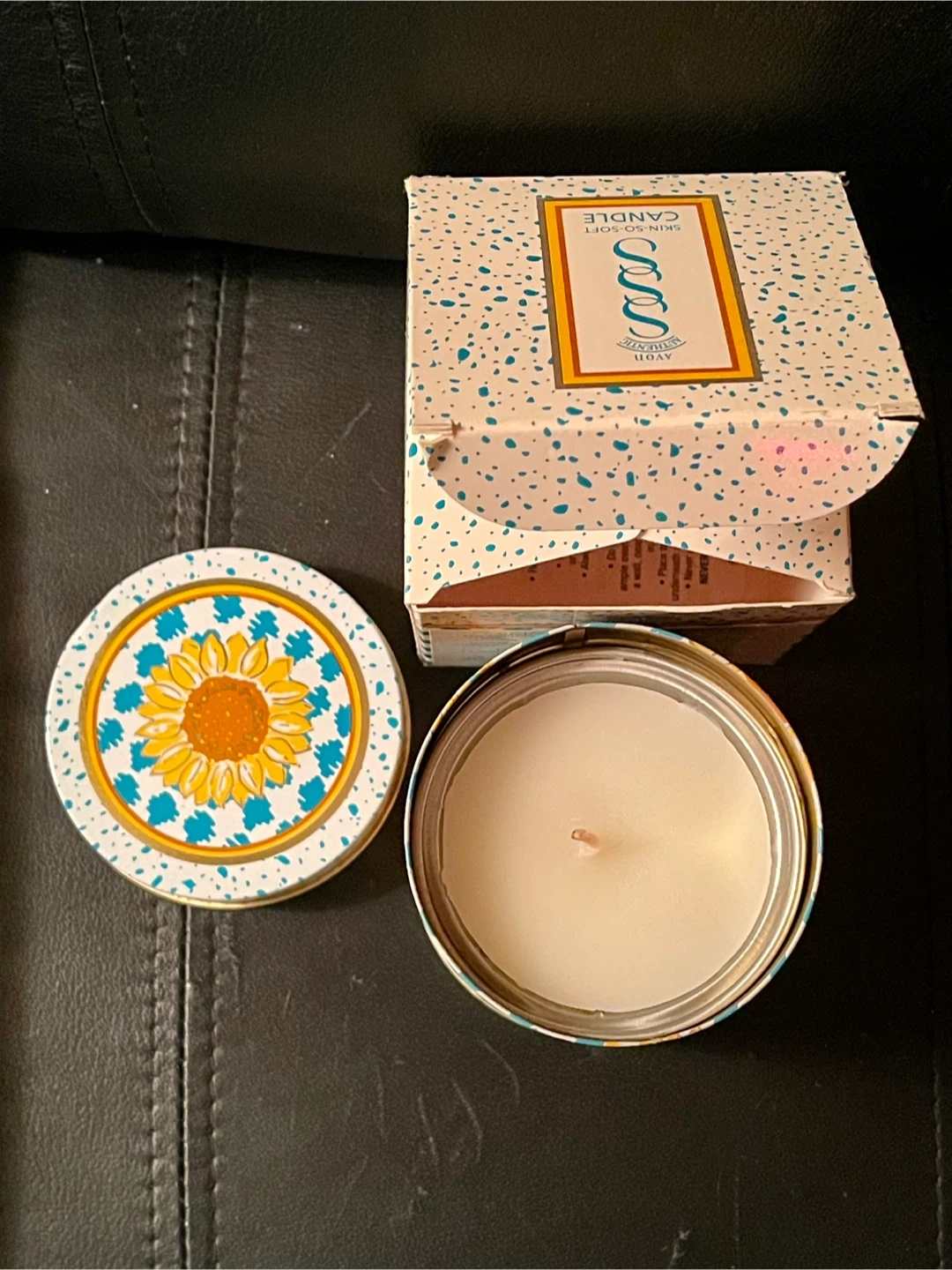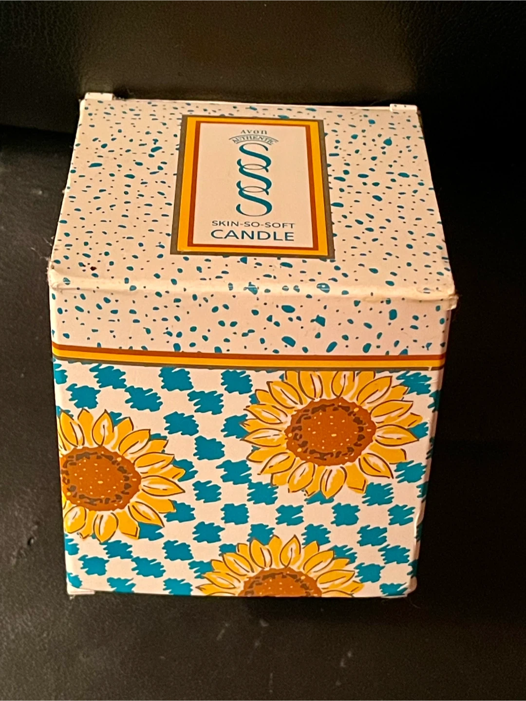 Selling a new, unused vintage Avon Skin-So-Soft candle! It comes with the original tin and box. The candle has a woodland-fresh fragrance and a decorative design with sunflowers and a blue checkered pattern on the box and tin. Tin is 3.5 inches tall. Made in USA.