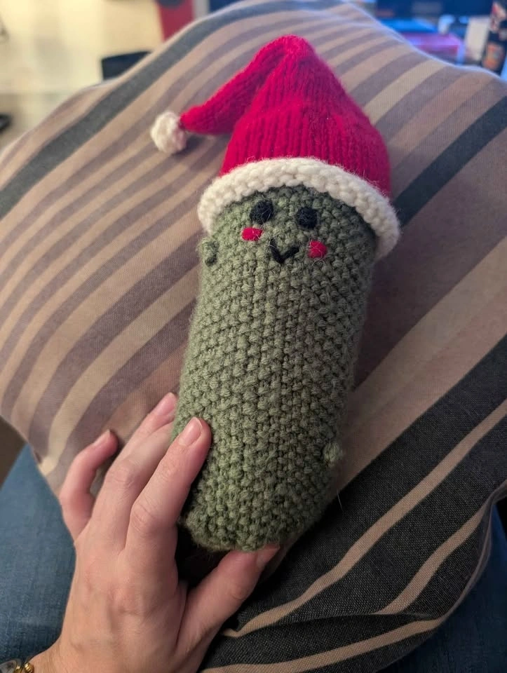 This handmade knitted Pickle Pal is the perfect companion! Whether you are in need of a tag-along for a little one, or emotional support for yourself, your Pickle Pal is there with you.