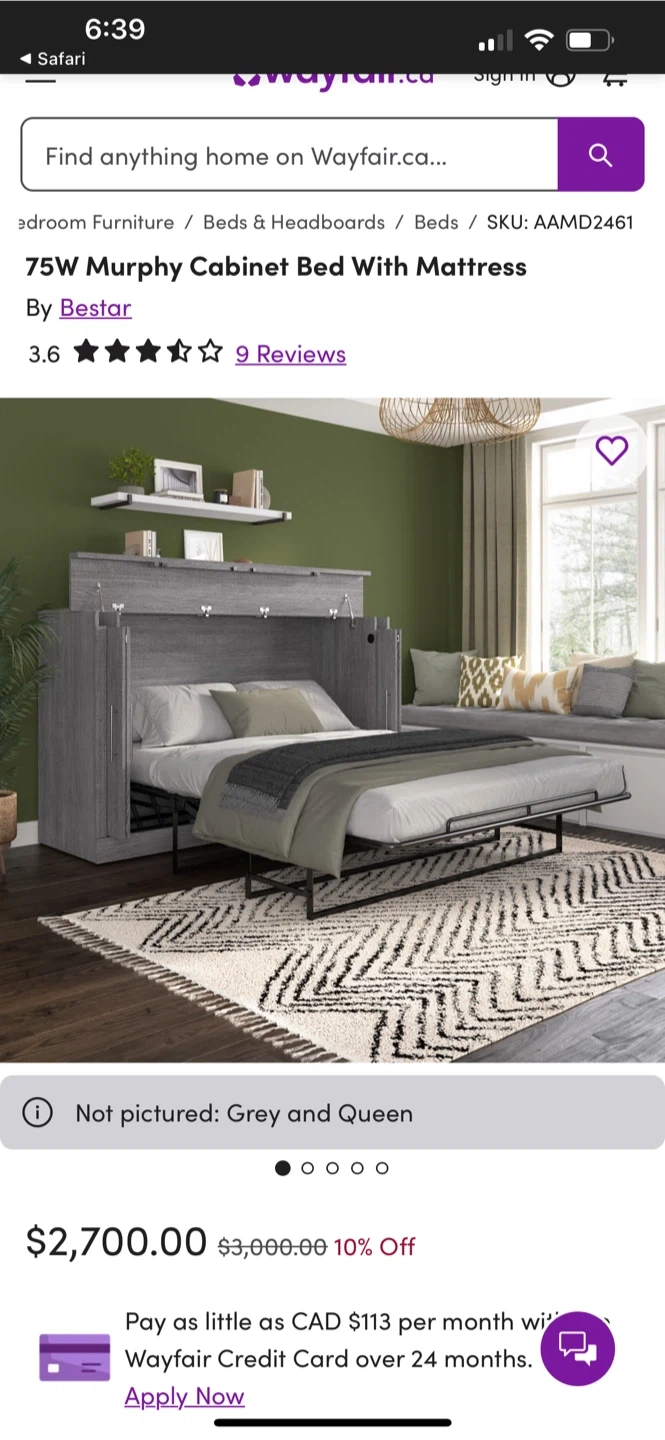 Buy & SellBestar 75W Murphy Cabinet Bed with MattressBestar 75W Murphy Cabinet Bed with Mattress$1,890Selling a Bestar 75W Murphy Cabinet Bed with Mattress. It's in great shape and perfect for saving space! Retails for $3,000.00ConditionNewWHERE TO MEETGeogre brown collegeView MapSELLERverifiedRoseDundas Station762 reviews1 chats·12 favorites·443 viewsSEND CHAT TO SELLERHi Rose! I’m interested in your listing.Hi Rose! I’m interested in your listing.Get the Karrot app to chatSign In to chat
