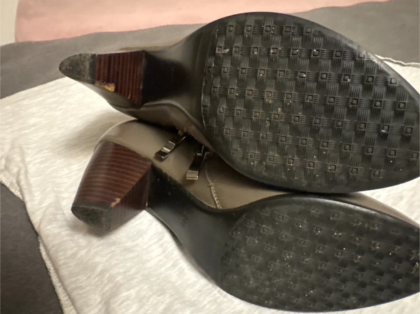 Worn and had few accidents on heels as shown. Otherwise very good leather.