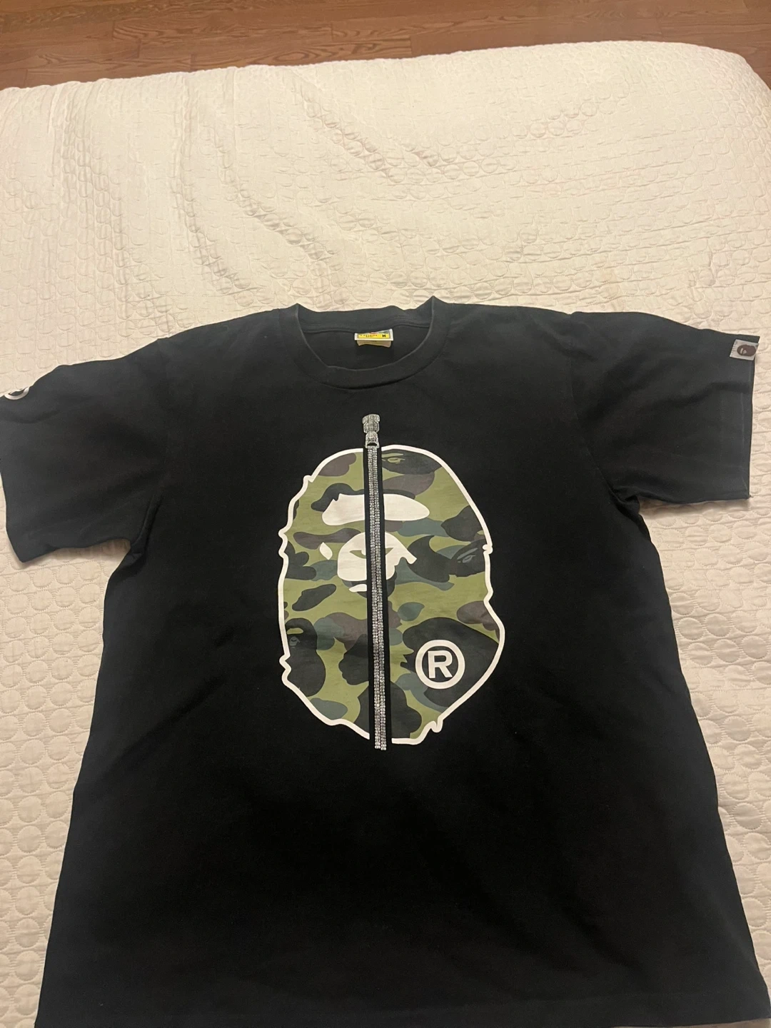 Selling a BAPE black t-shirt in size medium. The shirt features the iconic BAPE logo and design on the front and back. It's in great condition and ready for a new wardrobe!