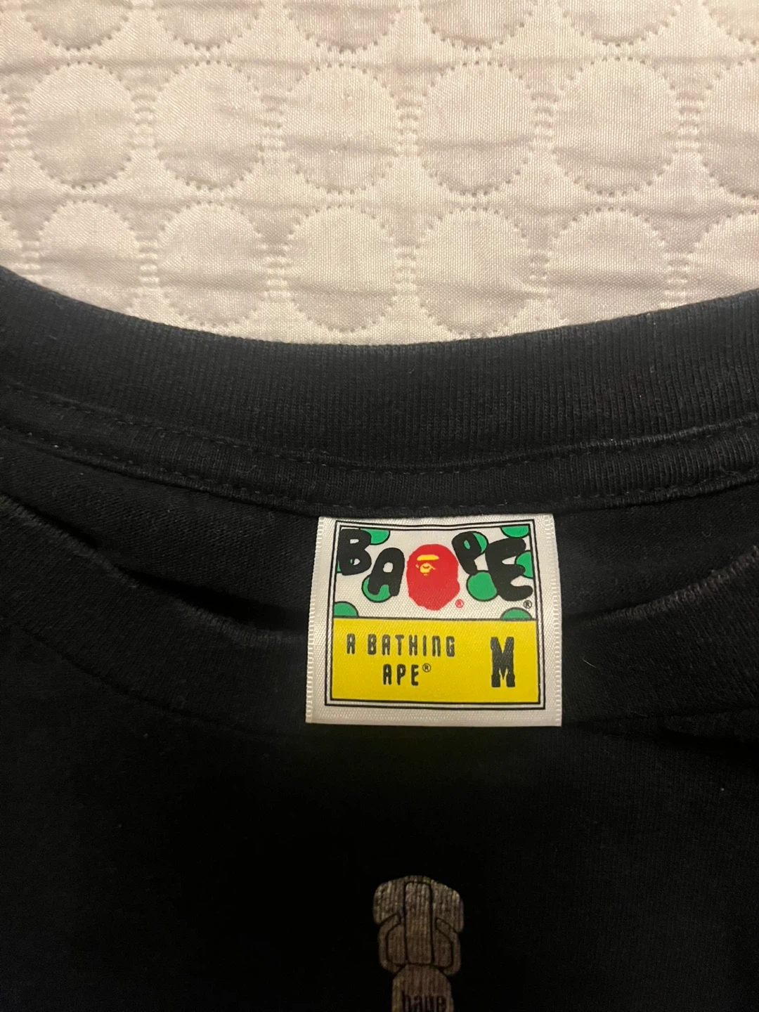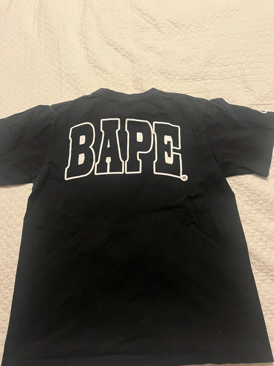 Selling a BAPE black t-shirt in size medium. The shirt features the iconic BAPE logo and design on the front and back. It's in great condition and ready for a new wardrobe!