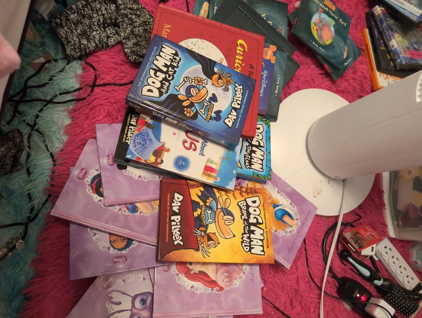 A collection of books for kids! Includes titles like Dog Man by Dav Pilkey, Disney books, and Curious George. Perfect for young readers there is about 30 books it's pretty cheap from the price what I paid. I'm pretty mad