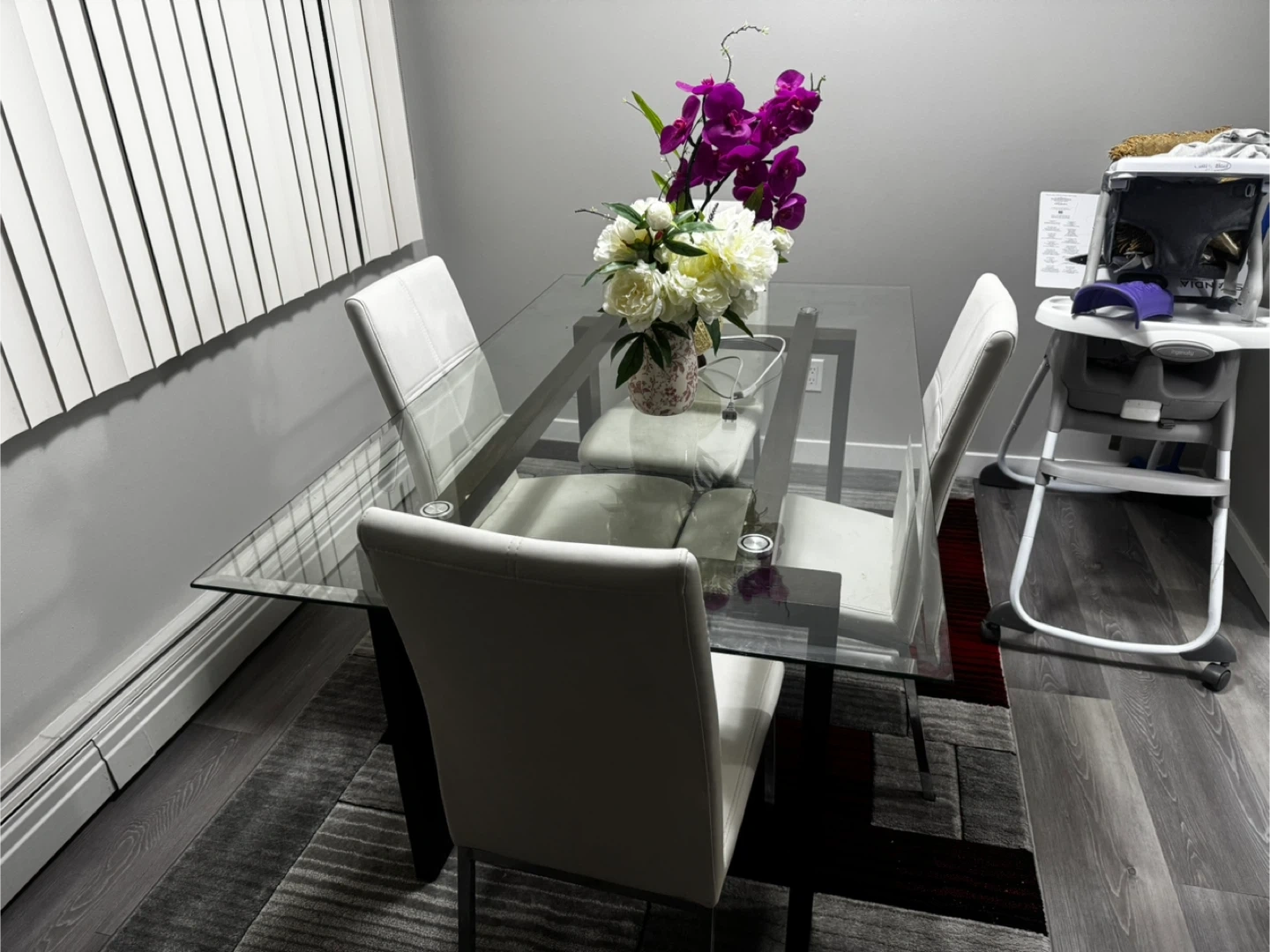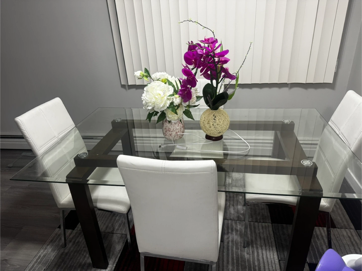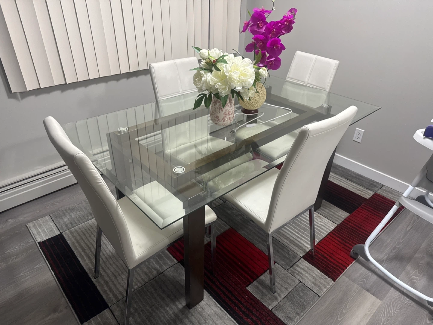 Selling a dining table with a glass top and four chairs. The chairs are white and have a modern look. The table is in good condition and would be great for a small dining area or kitchen!