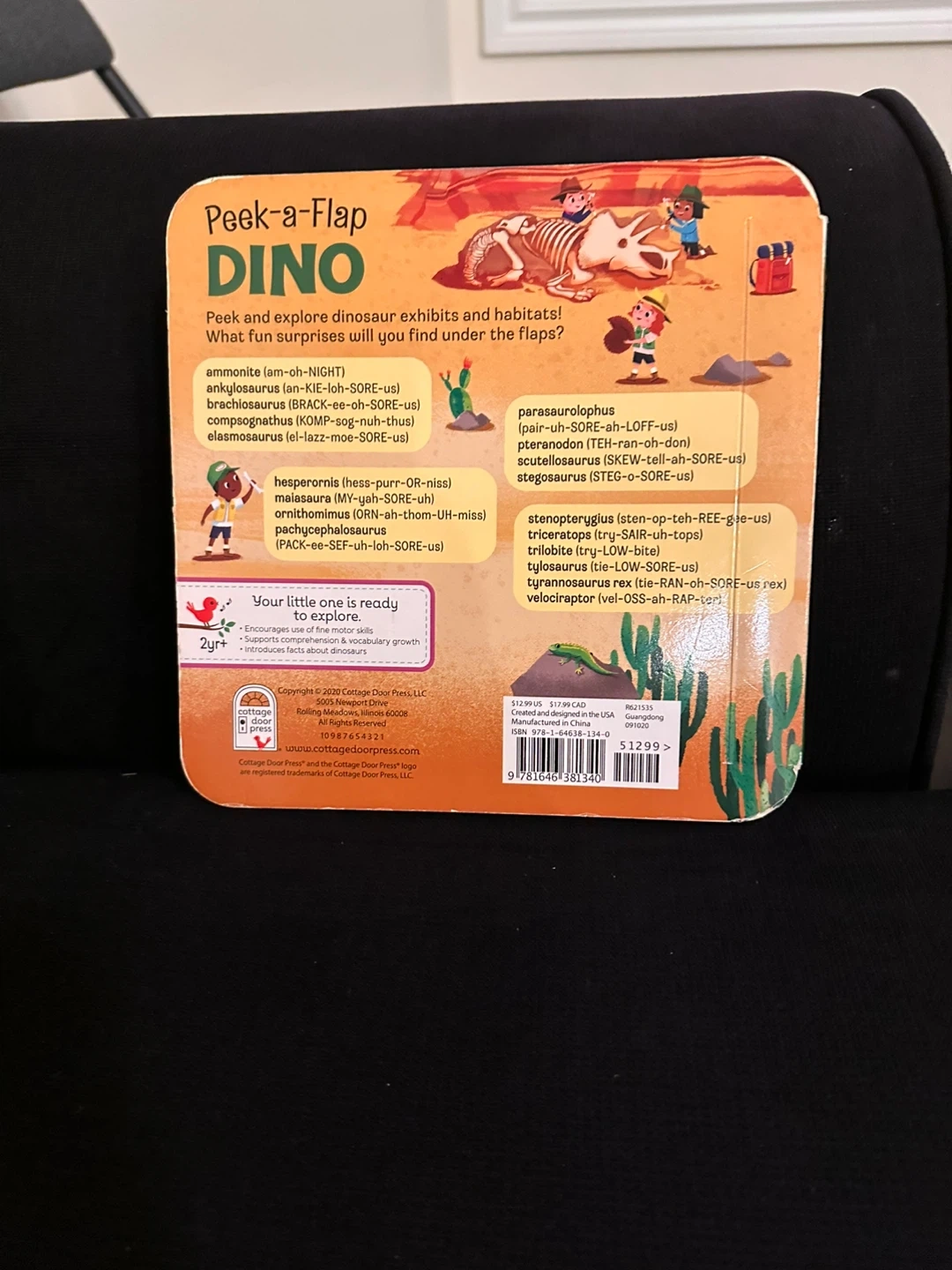 Selling a Peek-a-Flap DINO book! It's a fun way for your little one to explore dinosaur exhibits and habitats. There are 12 chunky flaps to peek and explore under!