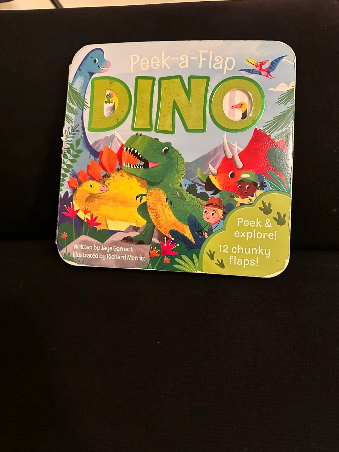Selling a Peek-a-Flap DINO book! It's a fun way for your little one to explore dinosaur exhibits and habitats. There are 12 chunky flaps to peek and explore under!