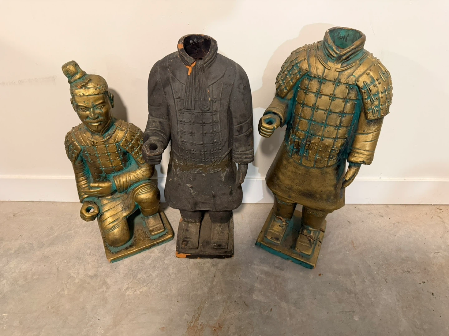 This is a unique terracotta army warrior statue that can also be used as a planter. It's a great piece for adding character to your home or garden. Kneeling solider is 25” standing ones are 30”