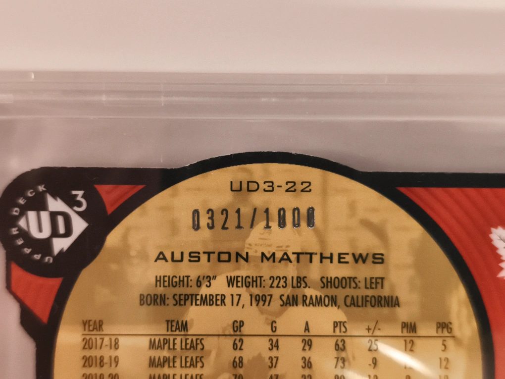 Buy & SellAuston Matthews 2020-21 Upper Deck CardAuston Matthews 2020-21 Upper Deck Card$50Selling an Auston Matthews 2020-21 Upper Deck hockey card, numbered #UD3-22 and 0321/1000. A great addition for any Maple Leafs fan or card collector!ConditionNewWHERE TO MEETCheck LocationView MapSELLERverifiedJordanPort Coquitlam761 review0 chats·0 favorites·6 viewsSEND CHAT TO SELLERHi Jordan! I’m interested in your listing.Hi Jordan! I’m interested in your listing.Get the Karrot app to chatSign In to chat