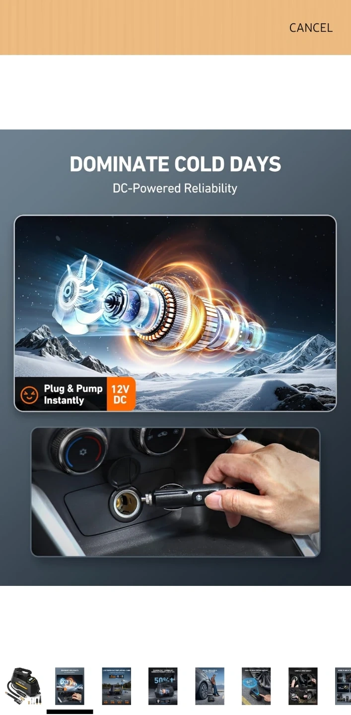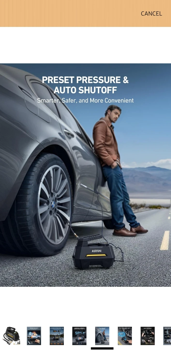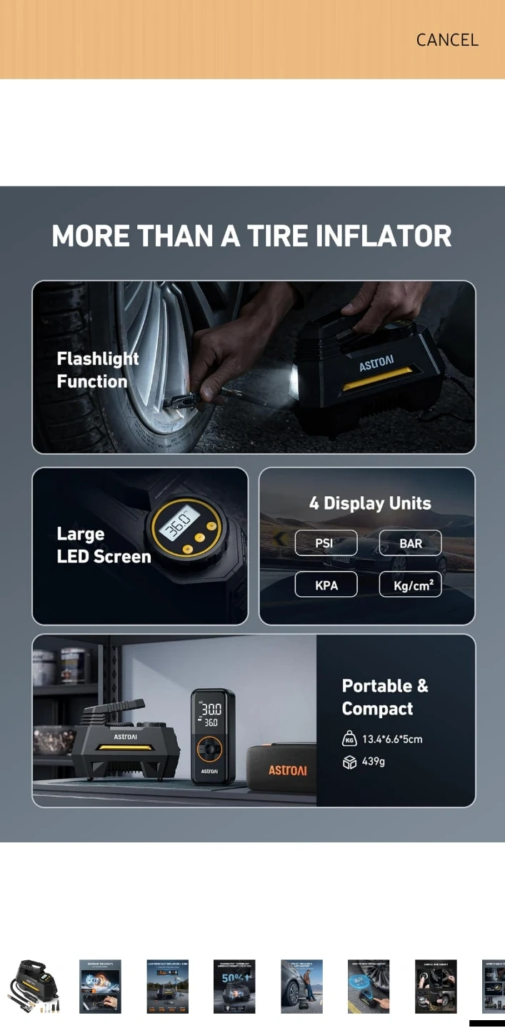 Selling an ASTROAI portable air compressor pump. It features lightning-fast inflation, inflating tires in under 1 minute. It's DC-powered for reliability on cold days and has a preset pressure with auto shutoff for convenience. The ToughUltra technology improves the product life by 50%. It can inflate car tires, ball tires, motorcycle tires, and bike tires.