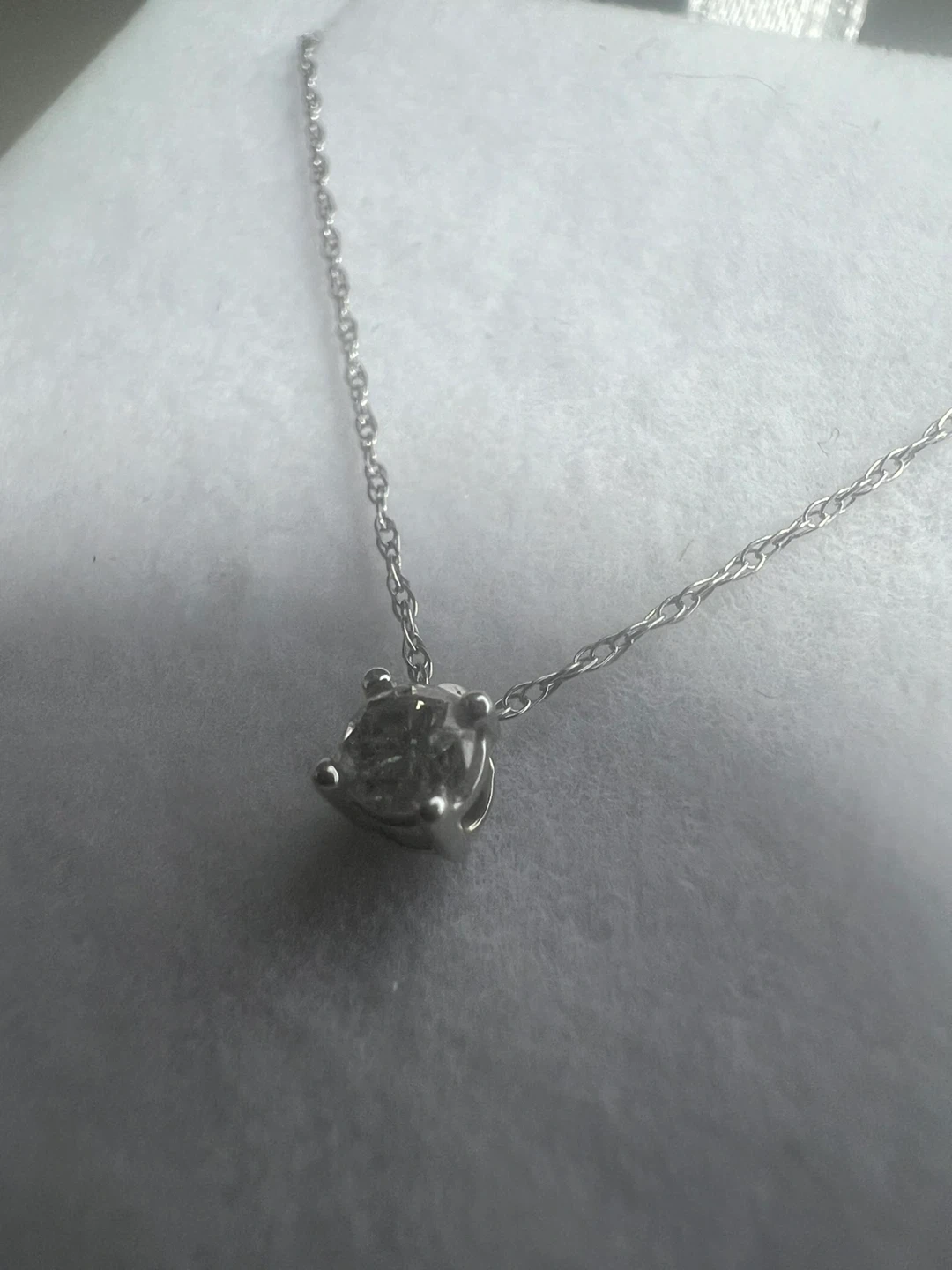 Selling a lovely 10K white gold necklace with a solitaire diamond pendant 0.15 carat It's a classic and elegant piece that would make a wonderful addition to any jewelry collection