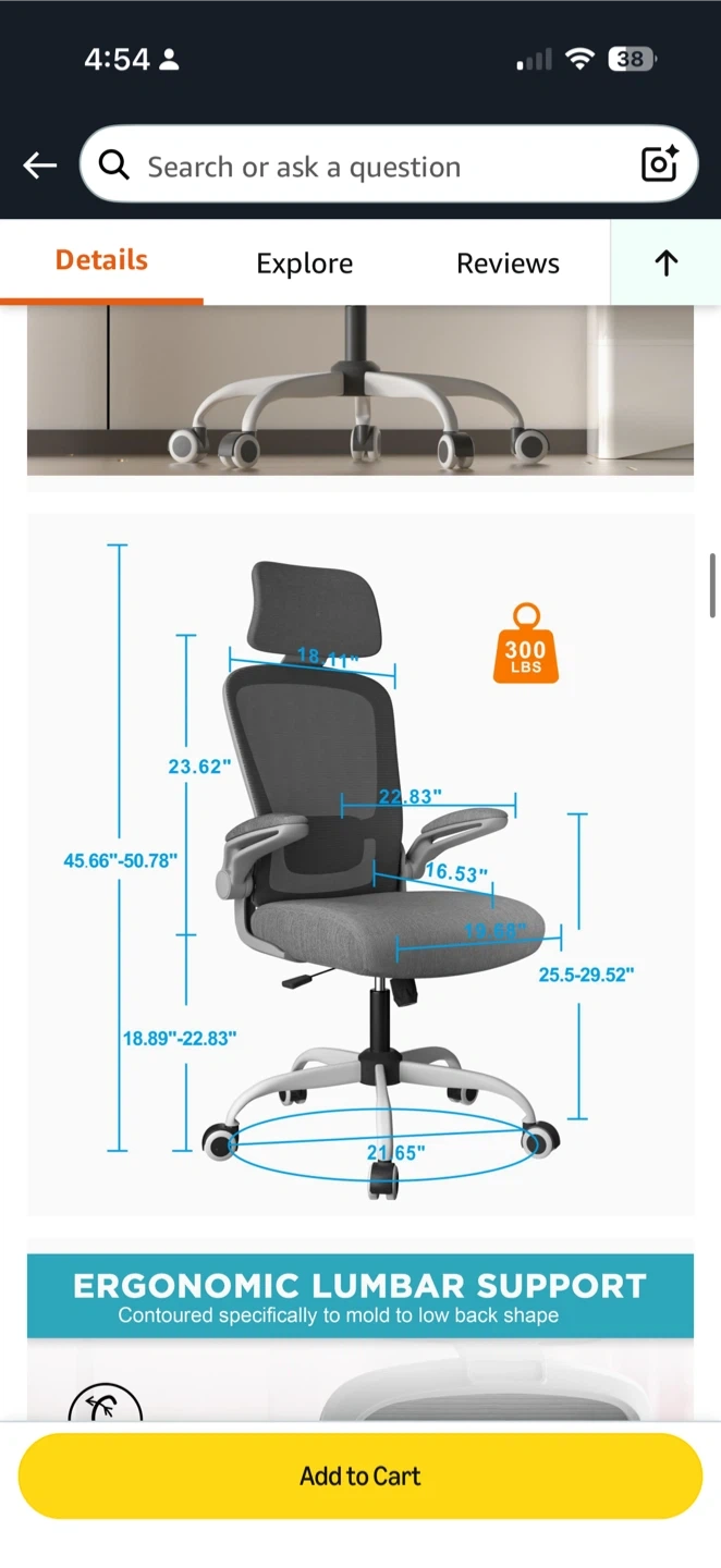 It features adjustable lumbar support, contoured to specifically mold to your lower back shape. The chair is designed to support up to 300 lbs.