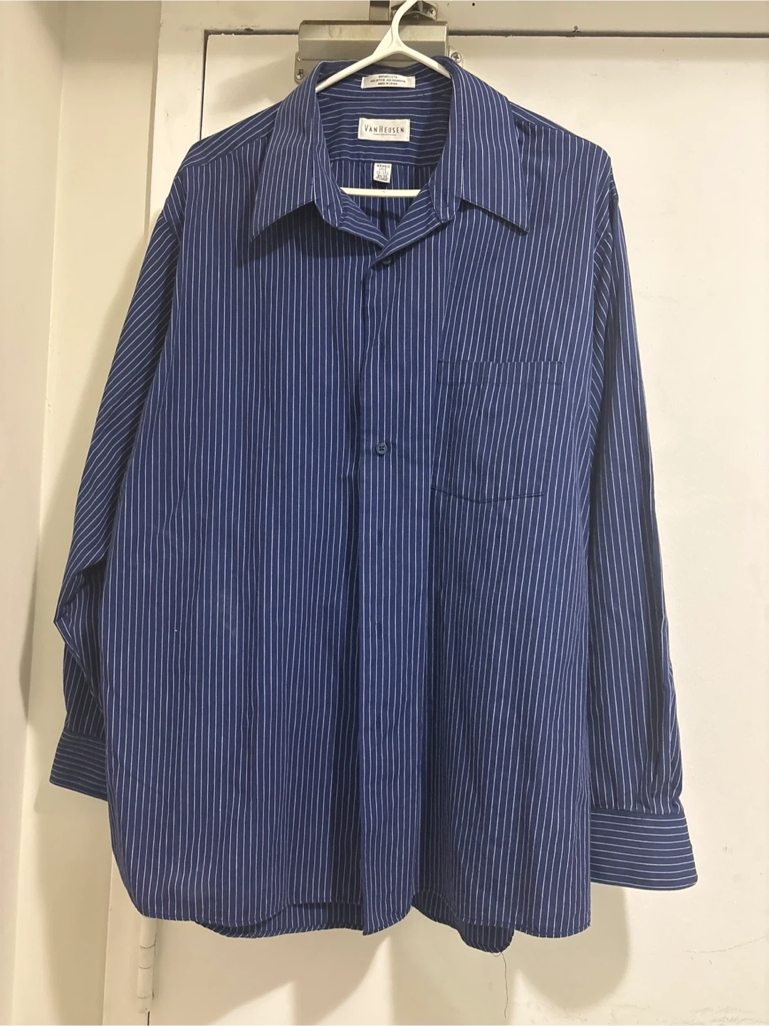 Here's a Van Heusen dress shirt in a classic blue and white pinstripe pattern. It's a size 17 1/2, perfect for a comfortable fit. It's in great shape and ready to wear!