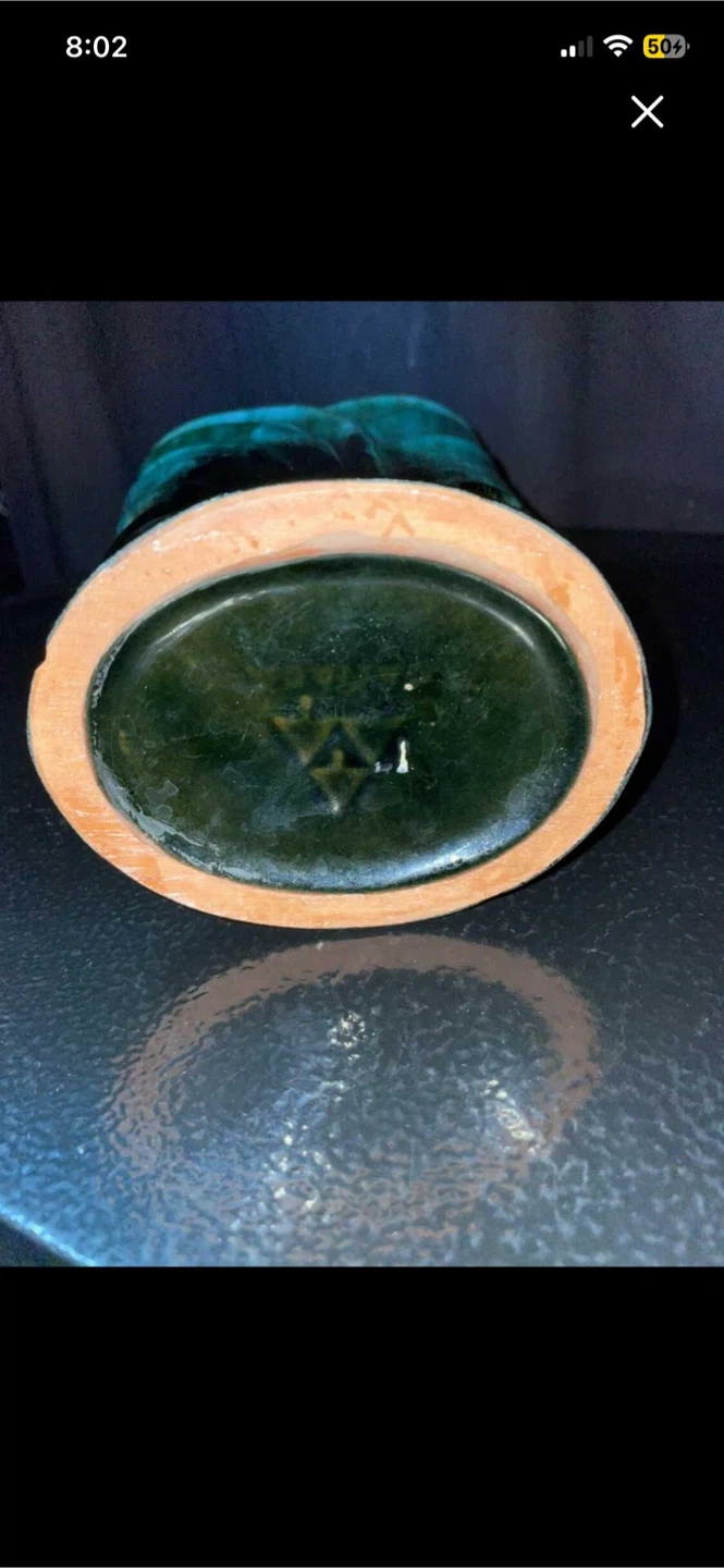 Selling a vintage green vase. It has a unique leaf-like design and a dark green to black gradient. It's in good condition and would look great as a decorative piece in your home