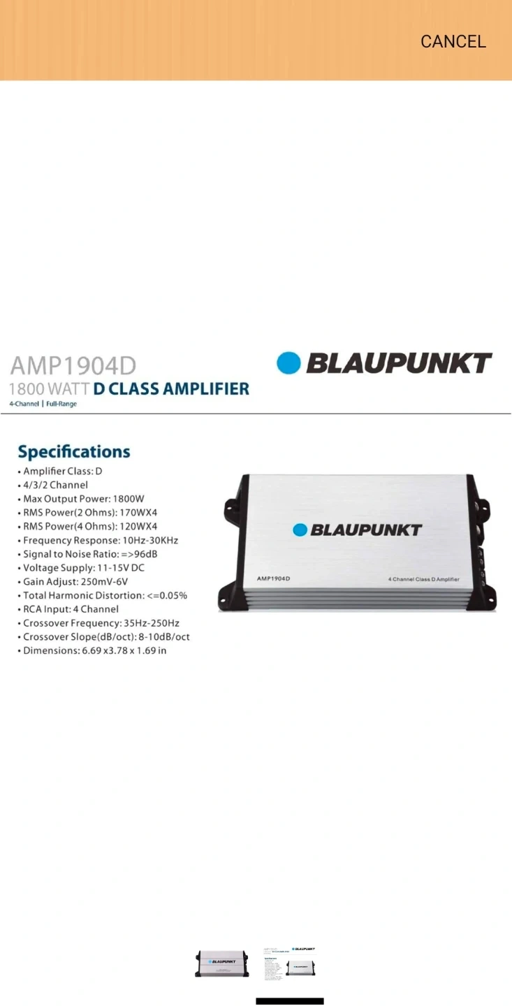 Selling a Blaupunkt AMP1904D 4-Channel D Class Amplifier! It has a max output power of 1800W and features 4 channels. The dimensions are 6.69 x 3.78 x 1.69 inches. Great for enhancing your car audio system