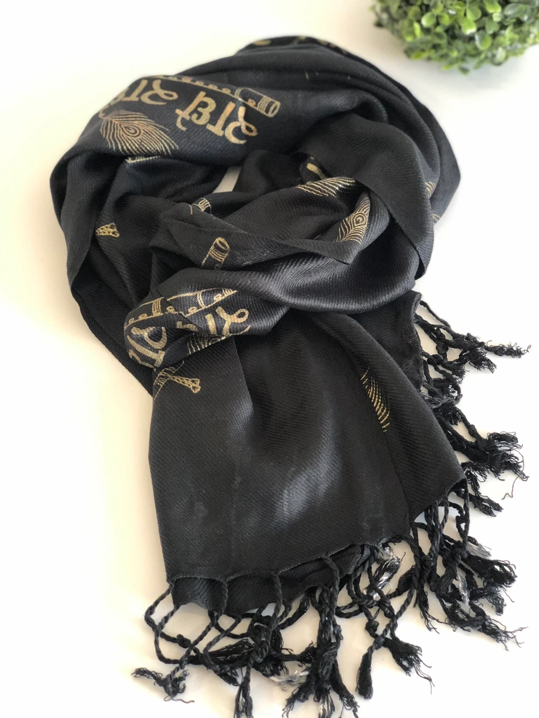 Selling a black scarf with a unique gold print. It's in great condition and perfect for adding a touch of elegance to any outfit! The scarf has tassels on the ends