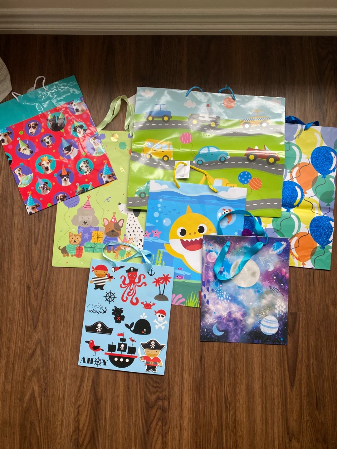 Selling a set of seven assorted gift bags! They feature fun designs like puppies, cars, Baby Shark, pirates, and space themes. Perfect for your next party or celebration