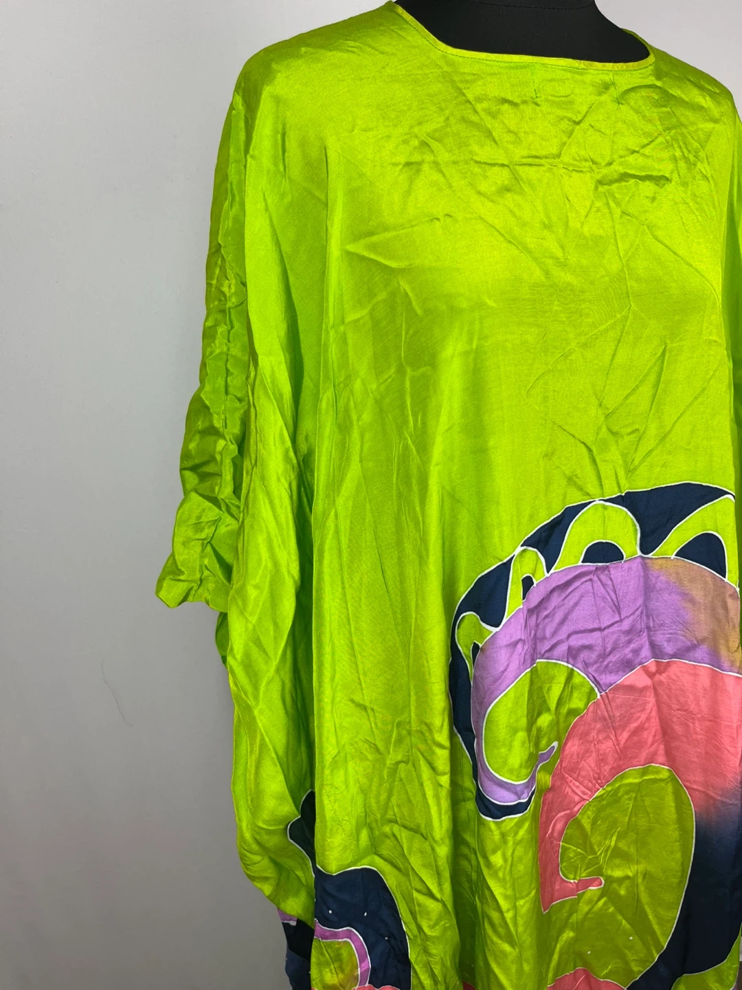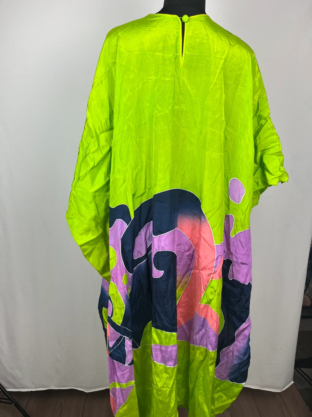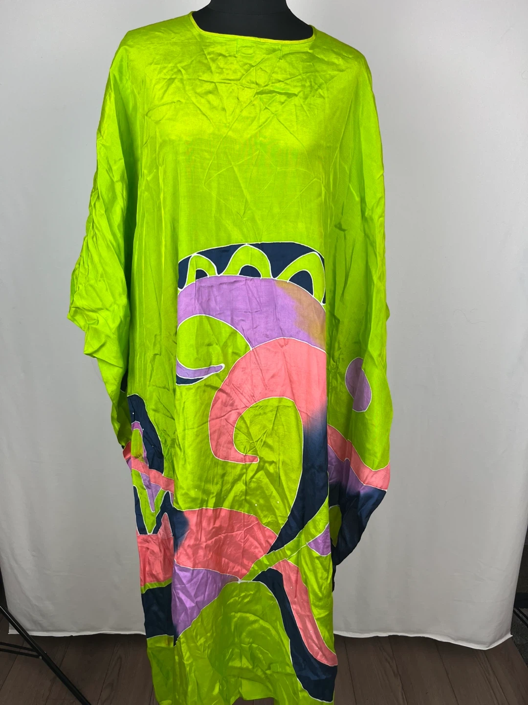 Lovely green silk kaftan dress with a unique design! It's lightweight and perfect for warmer weather. The material is silk and it's in great condition. It would be a great addition to your wardrobe!