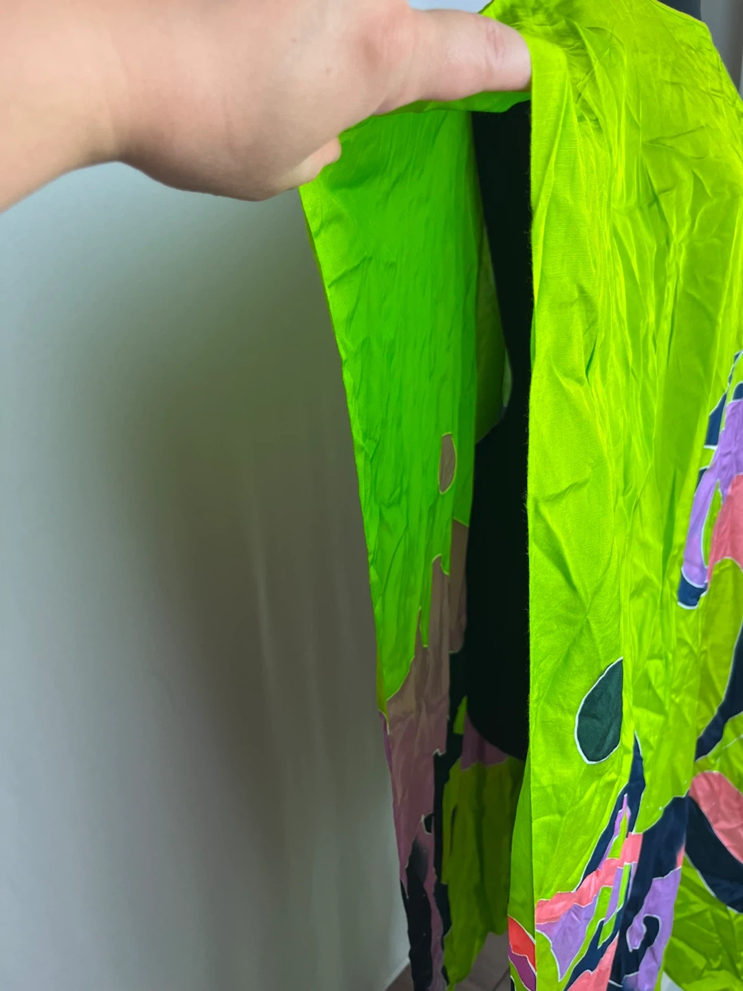 Lovely green silk kaftan dress with a unique design! It's lightweight and perfect for warmer weather. The material is silk and it's in great condition. It would be a great addition to your wardrobe!