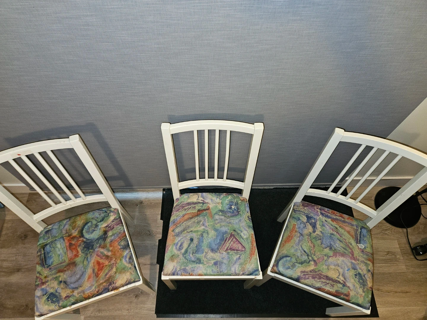 Selling a set of 3 white dining chairs from IKEA of Sweden! The chair has a colourful fabric seat.