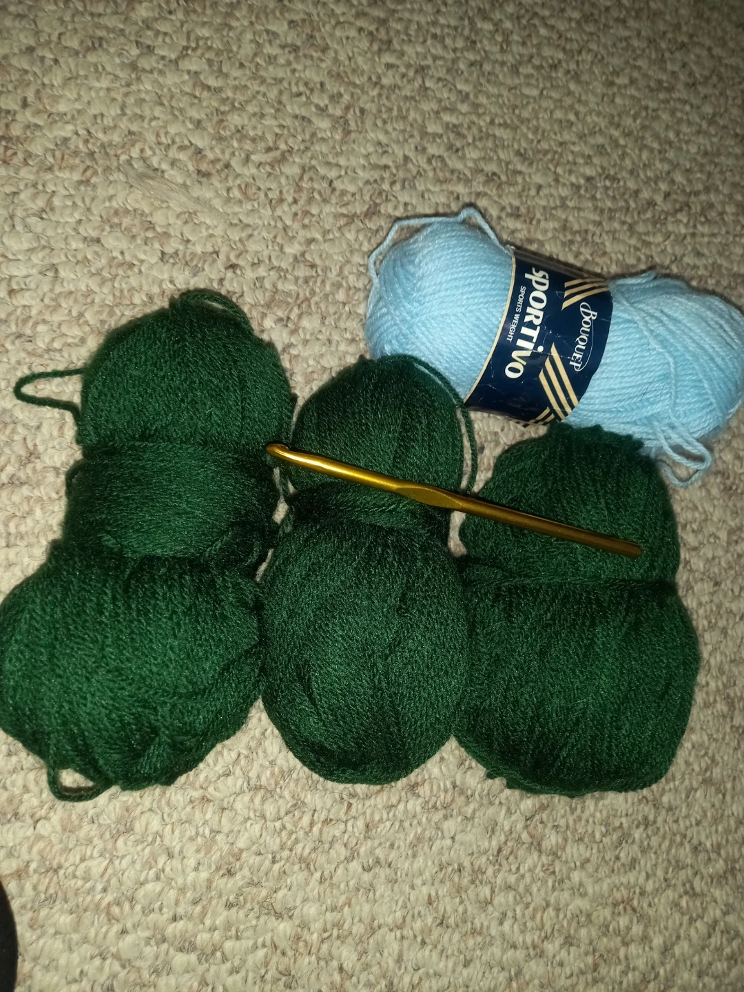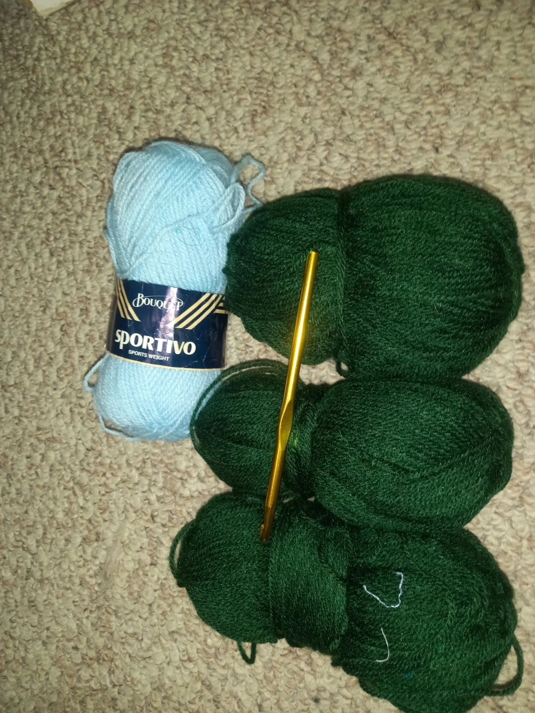 There are several balls of big dark green yarn and one ball of light blue yarn. Also included is a gold-coloured crochet hook. Perfect for your next knitting or crochet project!