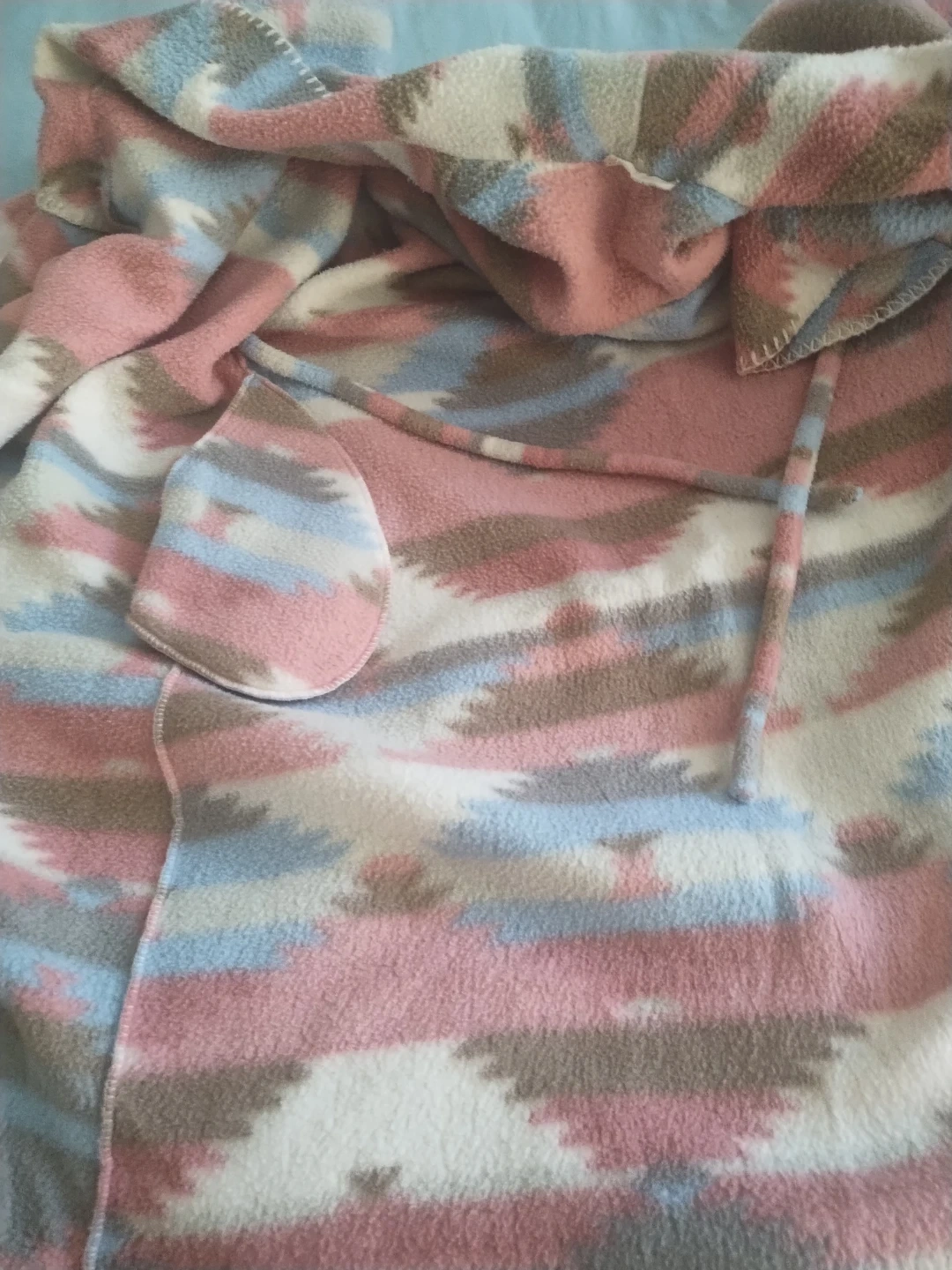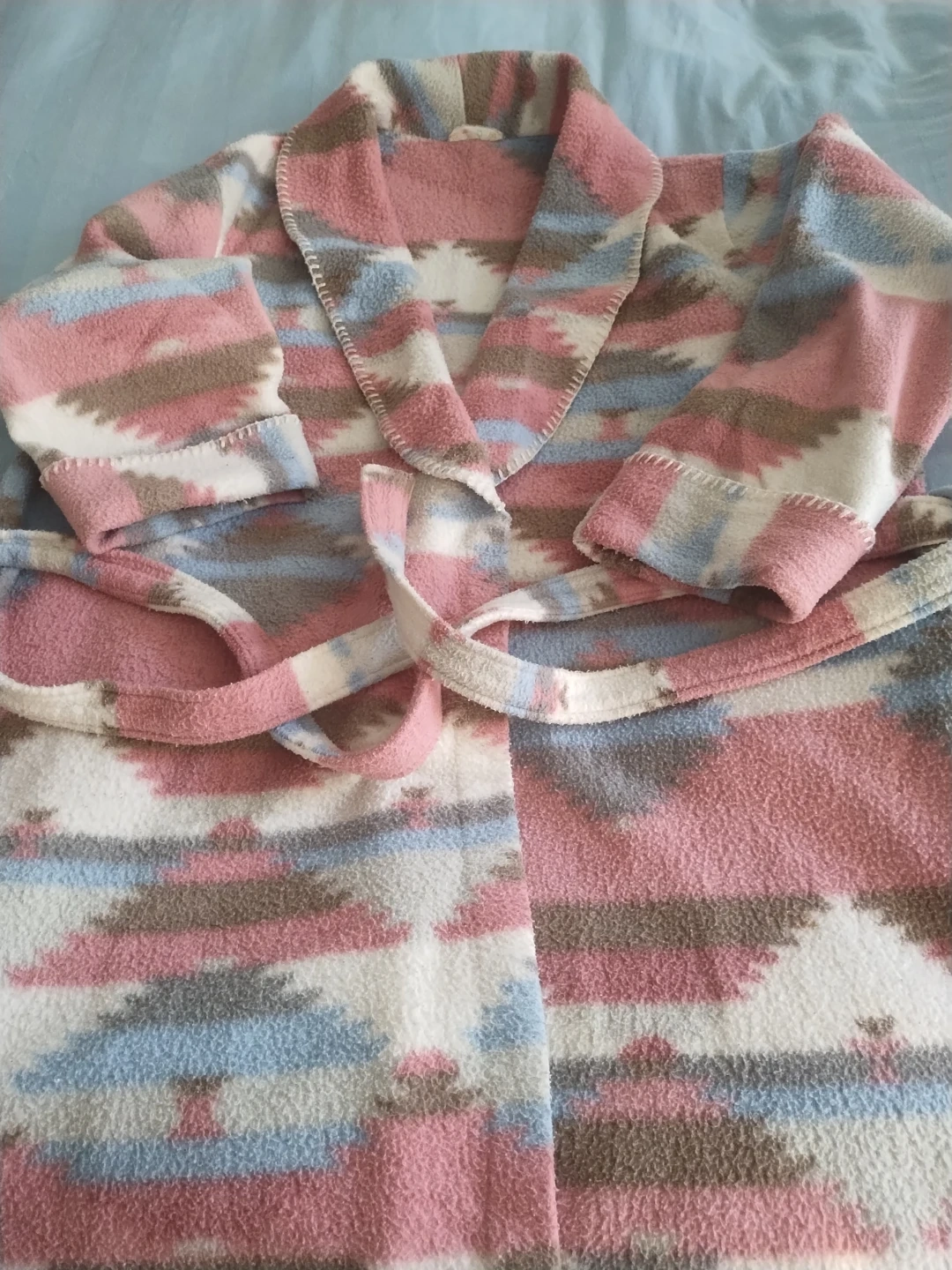 Cozy fleece robe with a unique pink, blue, and white pattern. Perfect for lounging around the house on chilly days!