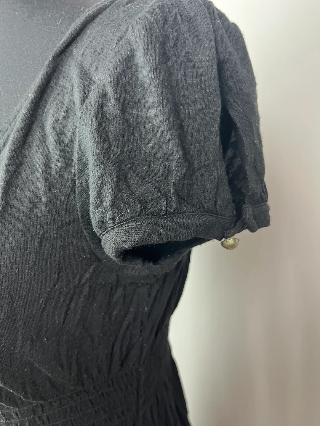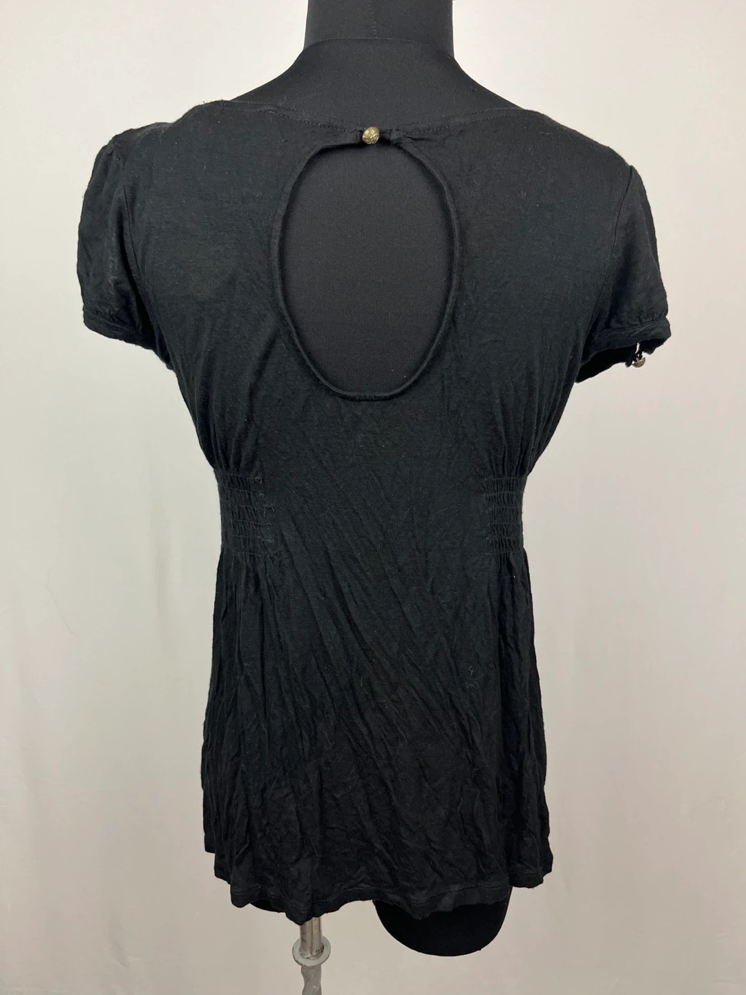 Selling a black Guess top in size medium. It has a v-neck and short sleeves with some shirring at the waist. It's in good condition and ready for a new home!
