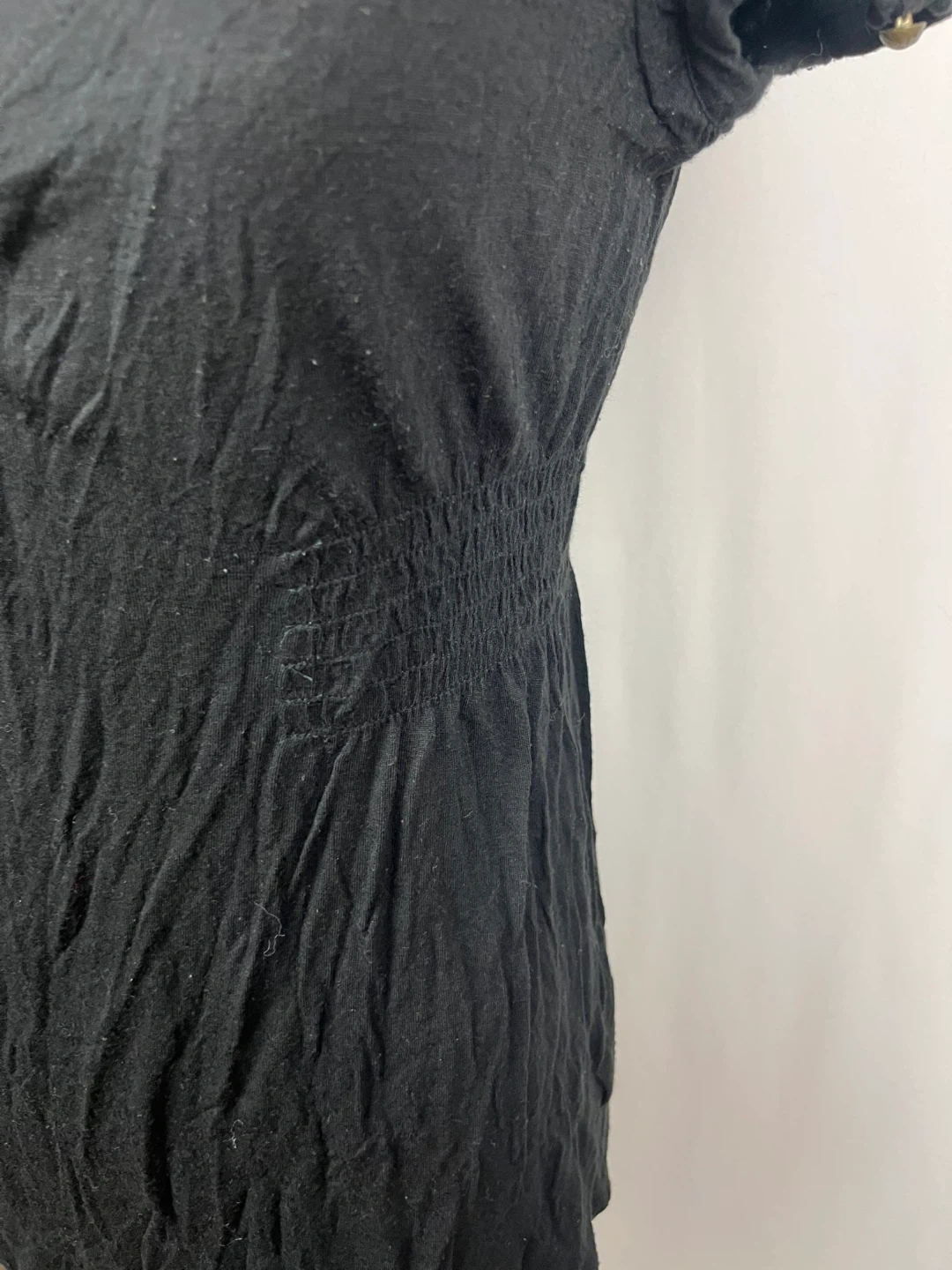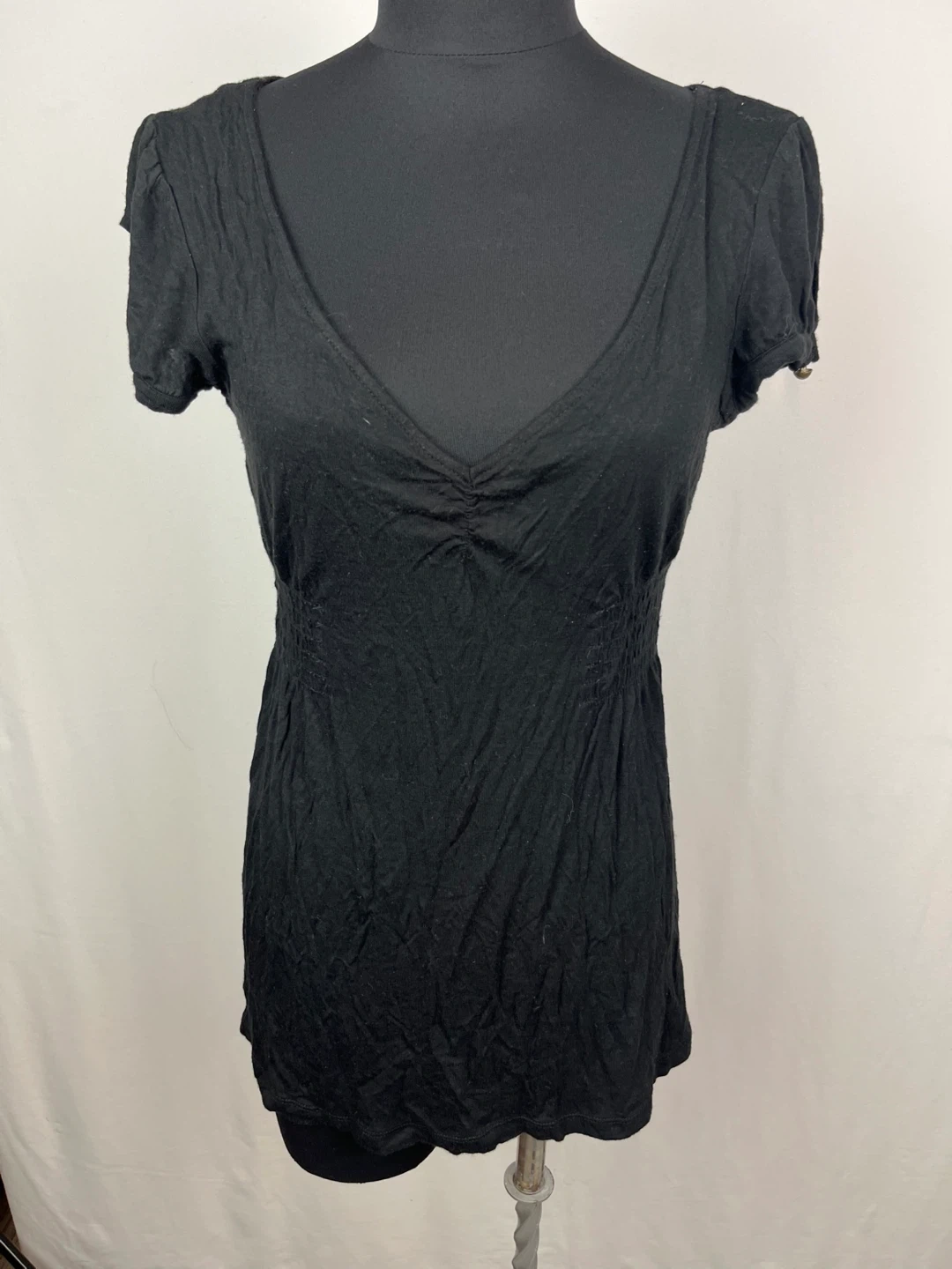 Selling a black Guess top in size medium. It has a v-neck and short sleeves with some shirring at the waist. It's in good condition and ready for a new home!